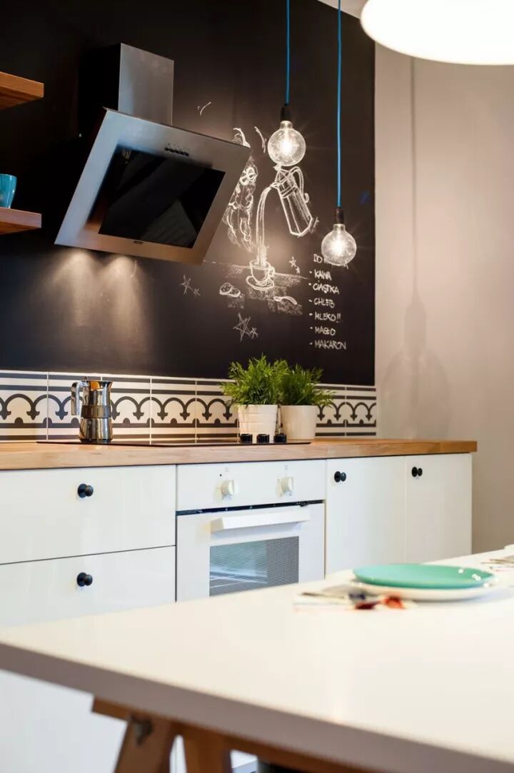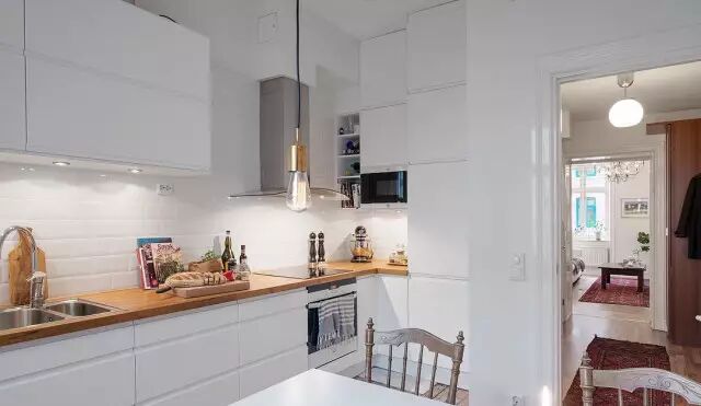白色橱柜+原木材质台面,简单温馨。随手创作的粉笔画,是厨房里的小风景。