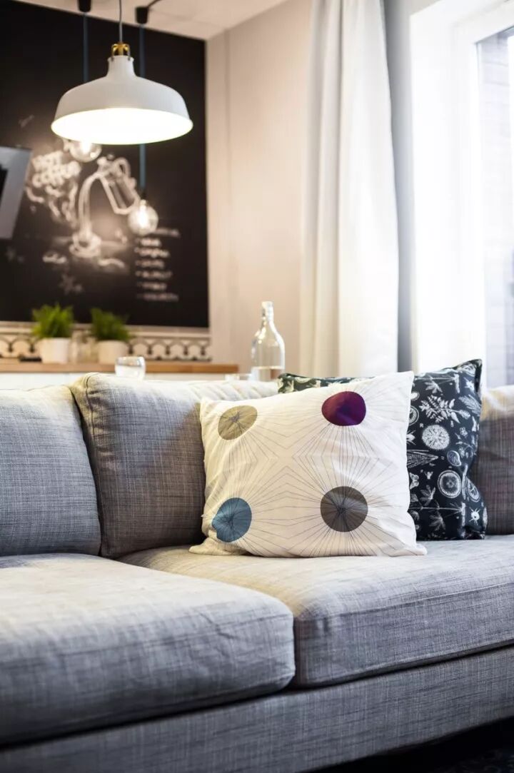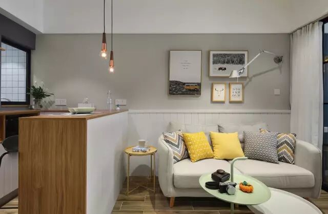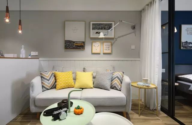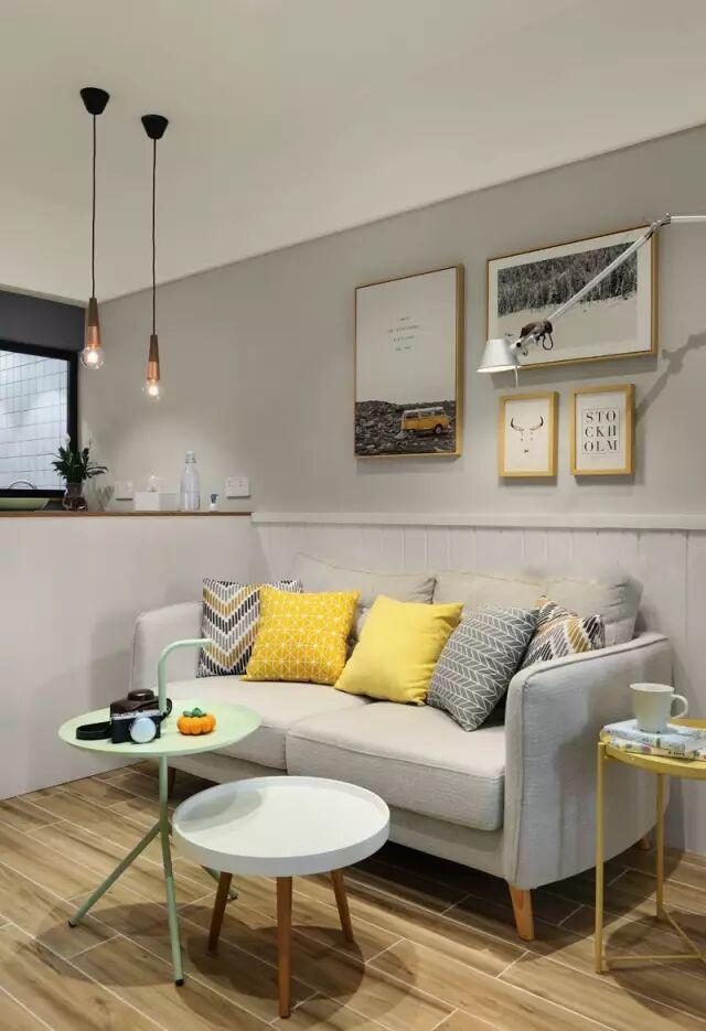 5平米不到的客厅空间,双人座沙发性价比蛮高。黄色边几选自宜家,抱枕与边几呼应选用明黄色,搭配嫩绿色的茶几,可爱明快的颜色点亮空间。