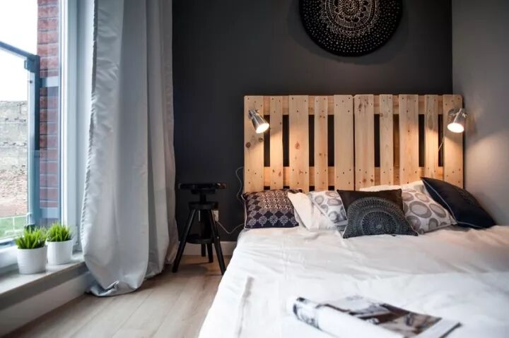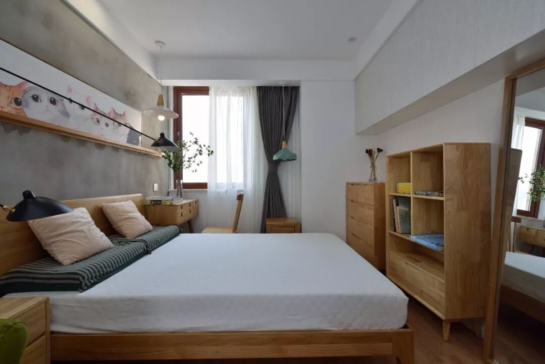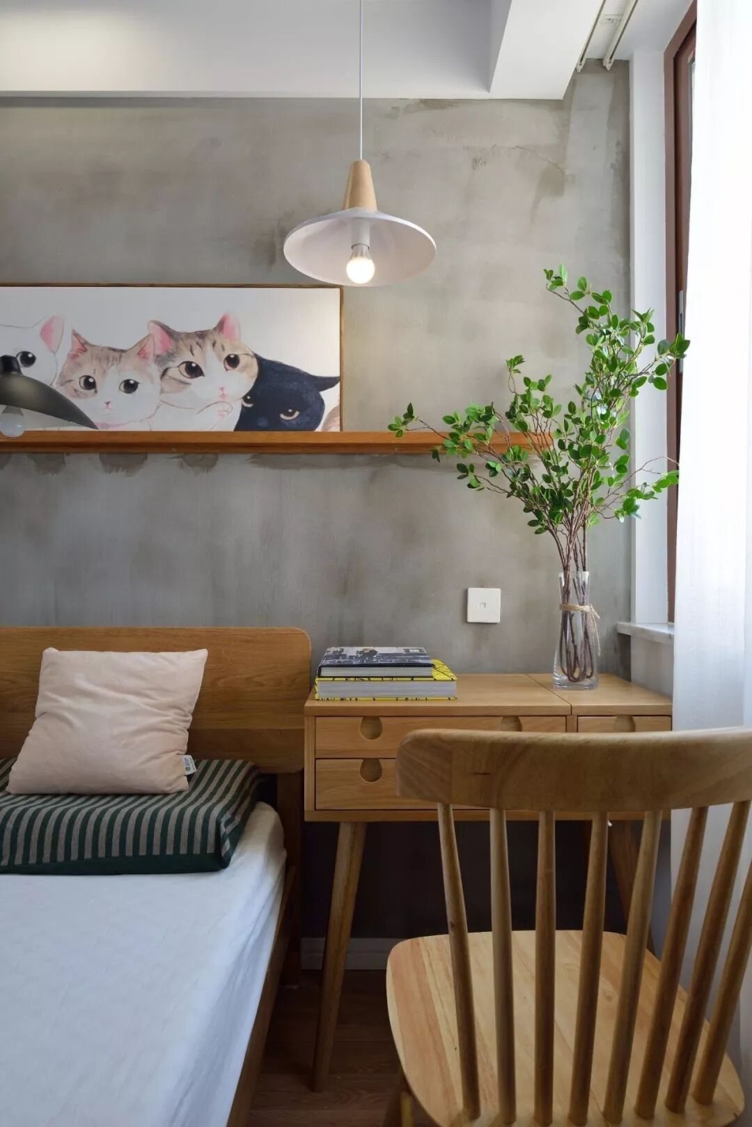原木材质的床头板,是原汁原味的工业风,床头灯瞬间将简陋变成了精致。