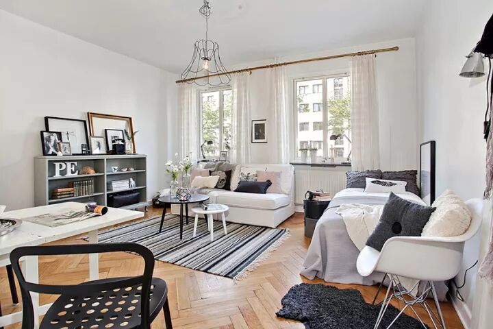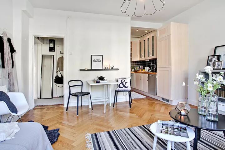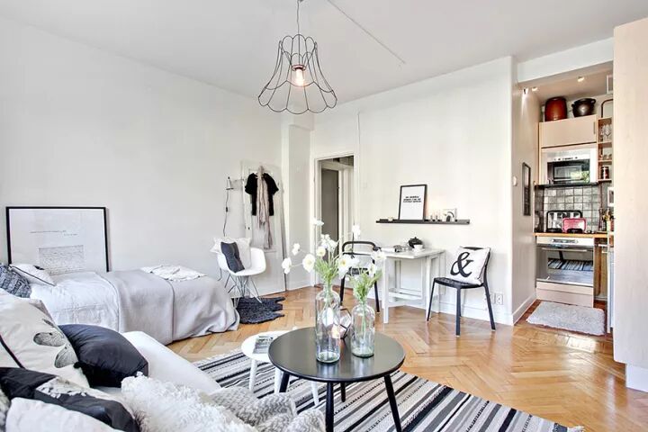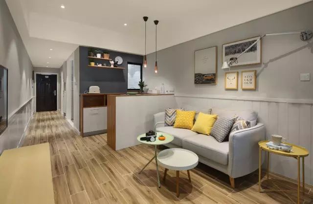 这就是26.5平米小公寓的客厅,整体北欧风的风格,原木色的地板,加上黑白灰的家具和饰品,让空间显得宽大又温馨。