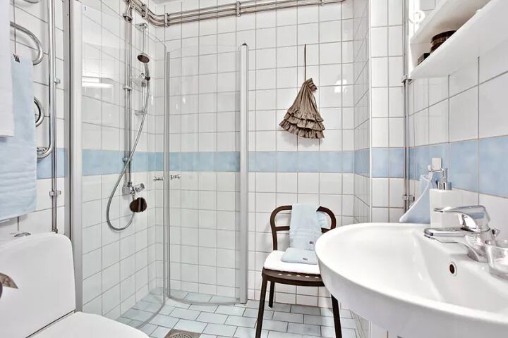 还有一个隐蔽的卫生间,由于空间非常有限,淋浴区的玻璃门都做成了折叠式的,可整体纯白瓷砖,硬是让你看不出它的局促,就是要让你觉得它的整洁和简单。
