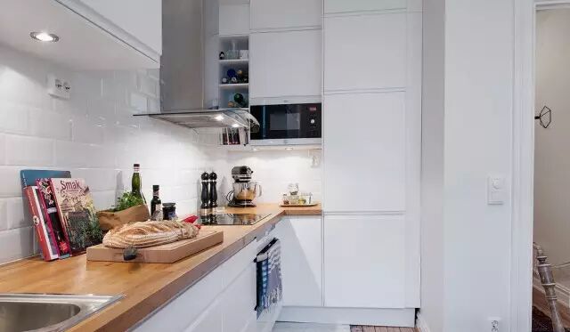 原木色的案台与纯白色的橱柜相搭配,让人在烹饪的时候都可以心平气和!