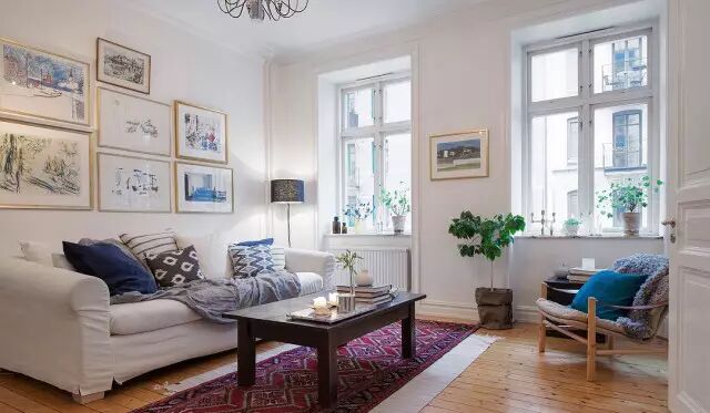 客厅中也用了一块波西米亚风情的地毯,增添了客厅的色调;两扇窗的设计让这个客厅更加通明;还有一把休闲椅也是搭配得非常得体。由此看来小户型设计也是满满的小幸福哦!