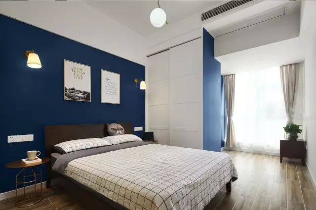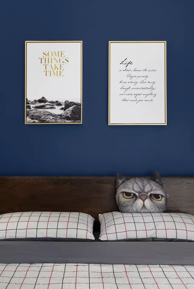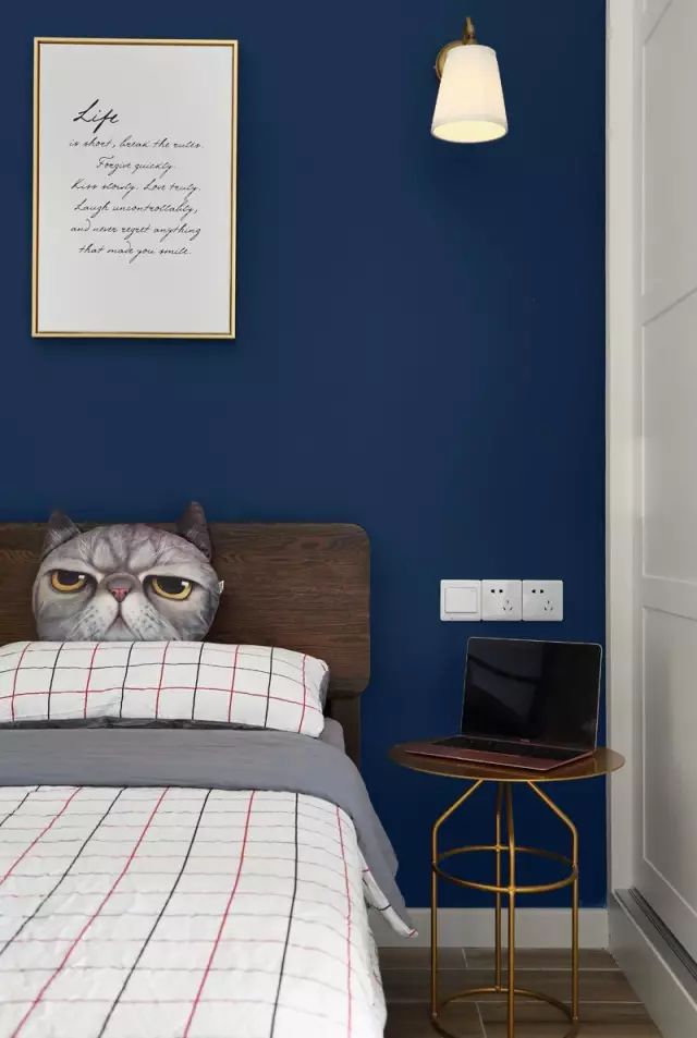 卧室空间,深蓝色的墙面让整个空间显得静谧深邃,金色框的挂画和蓝色搭配很显质感。