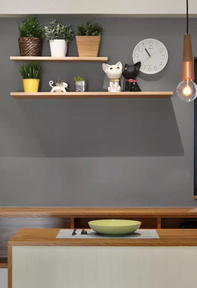 被设计师分隔出来的开放式餐厅。因为房型限制没有办法放置常规的餐桌,设计师用吧台做了半隔断处理,兼顾了休闲和用餐两个功能。