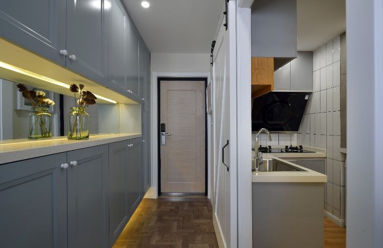用色不会特别暖是因为本身性格就有点冷的那种,单身或者两个人住刚刚好。长条的户型,进门左手边就是厨房,右手边就储物柜跟衣柜。