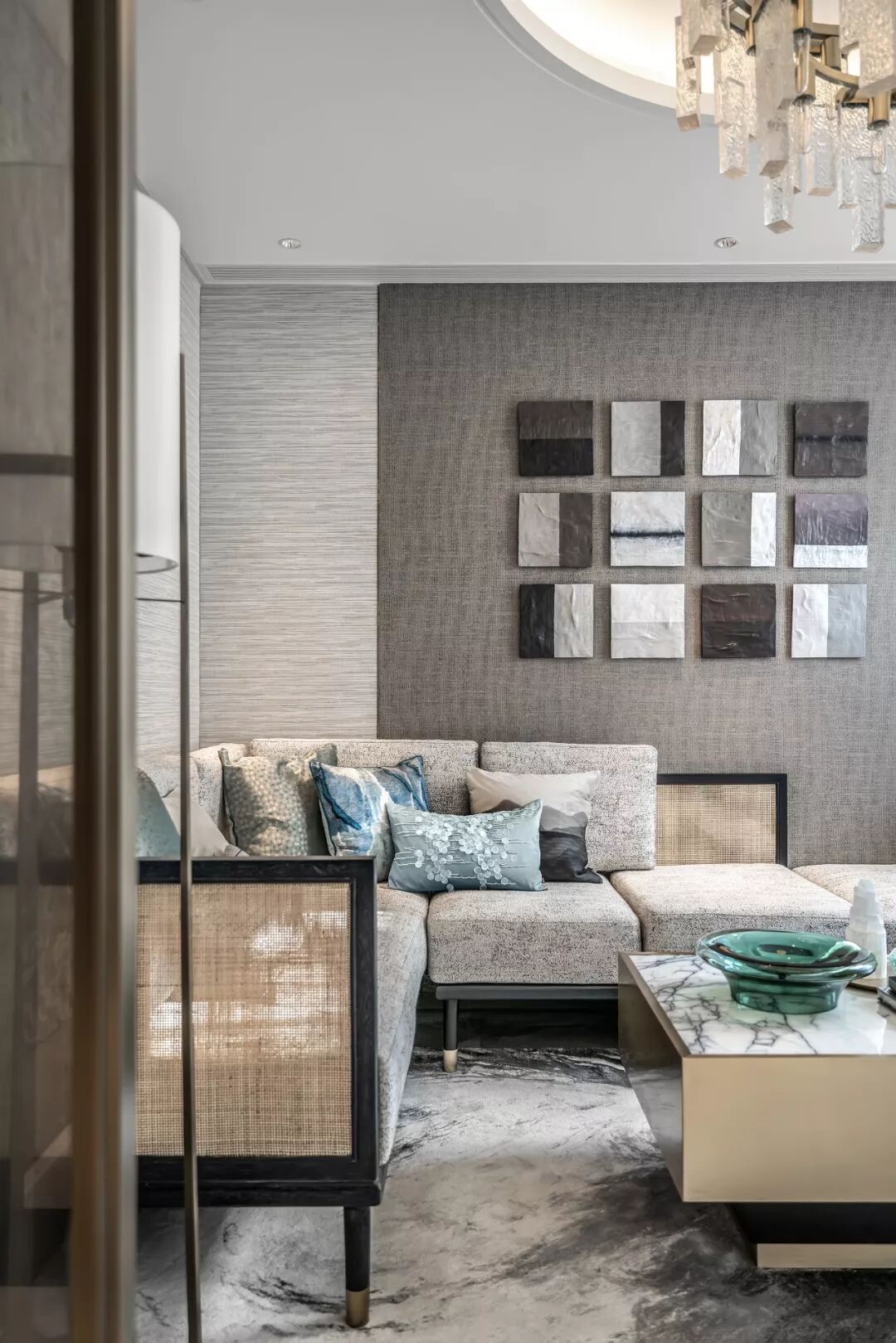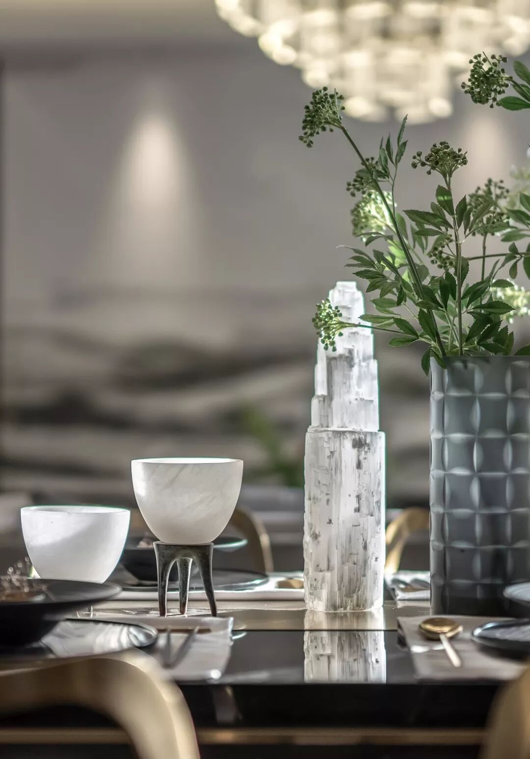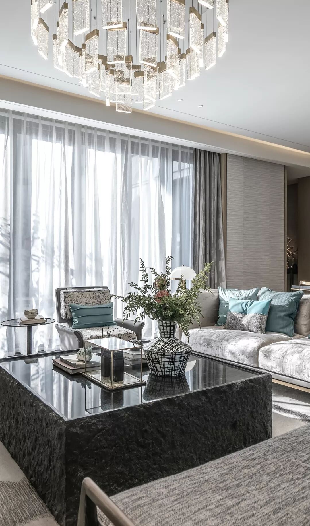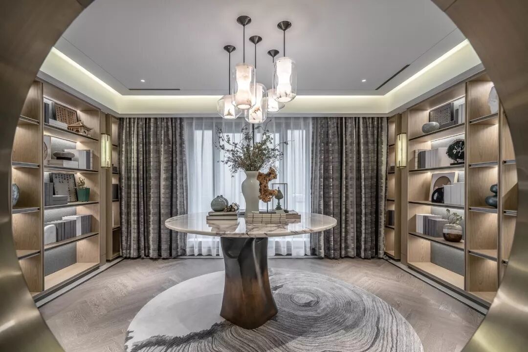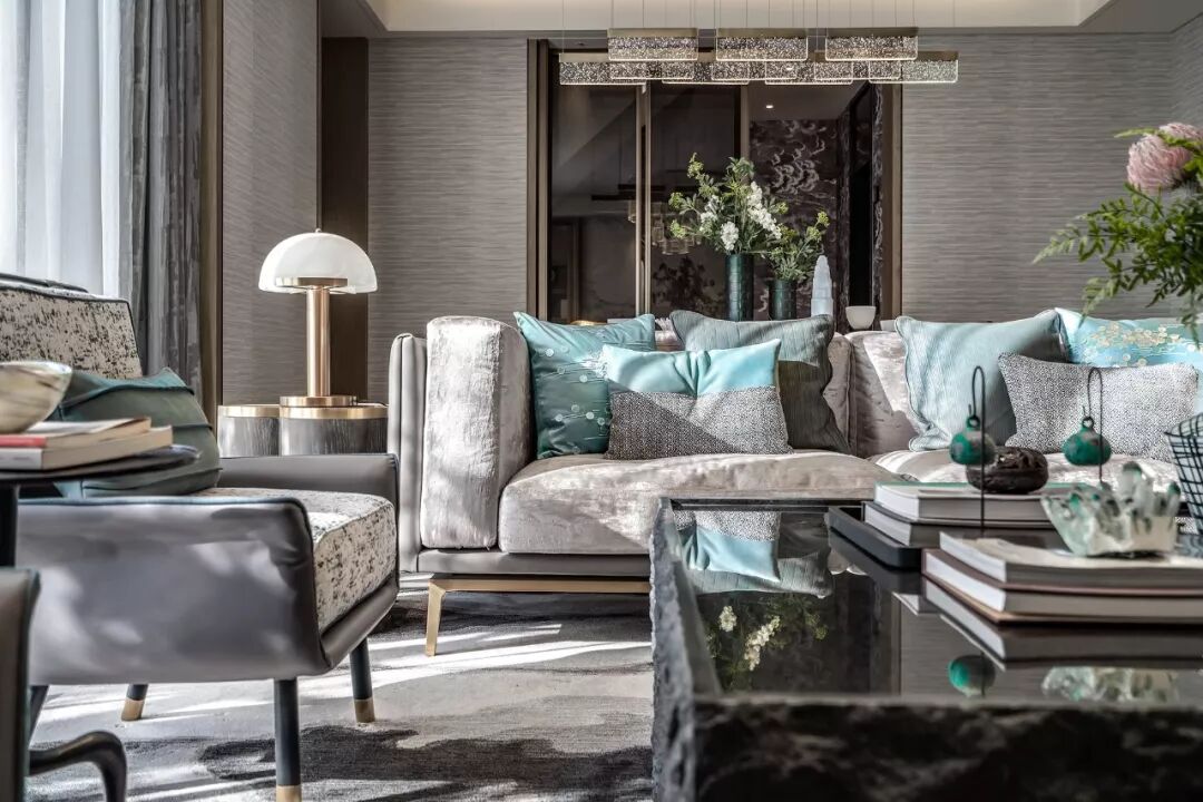 高贵的气质在高级灰与清雅的绿色结合的刹那占领整个空间,出于对传统文化内蕴的理解和传承文脉的高远信念,在吊灯温润的质感与盈透的色泽中,闪耀着粼粼波光。