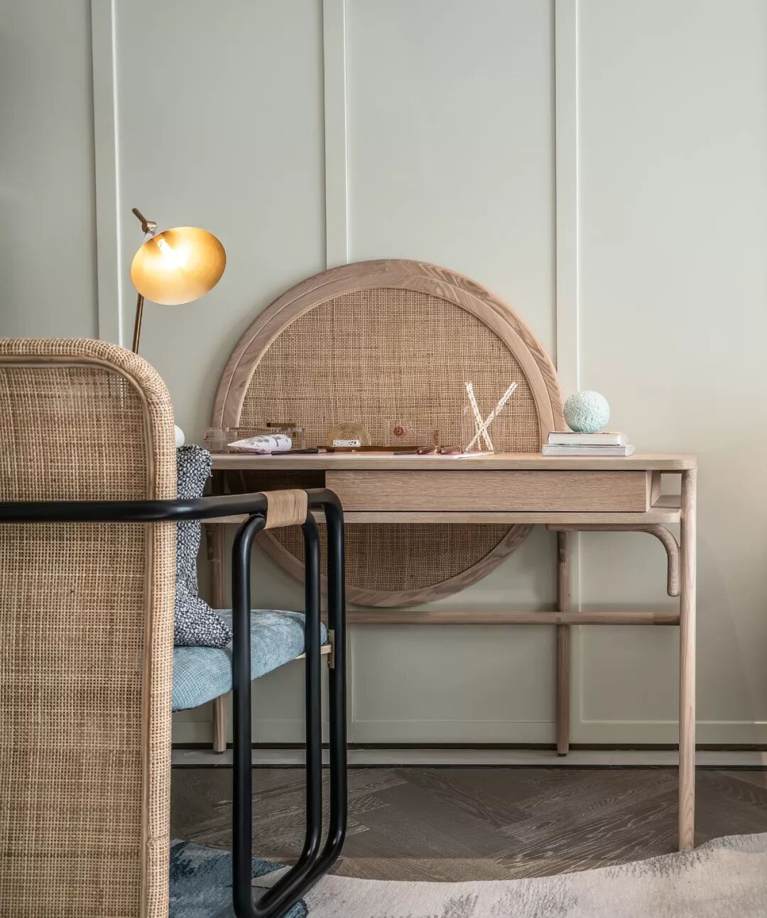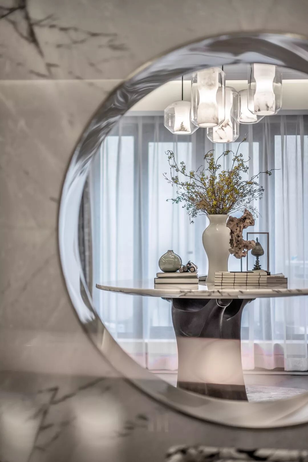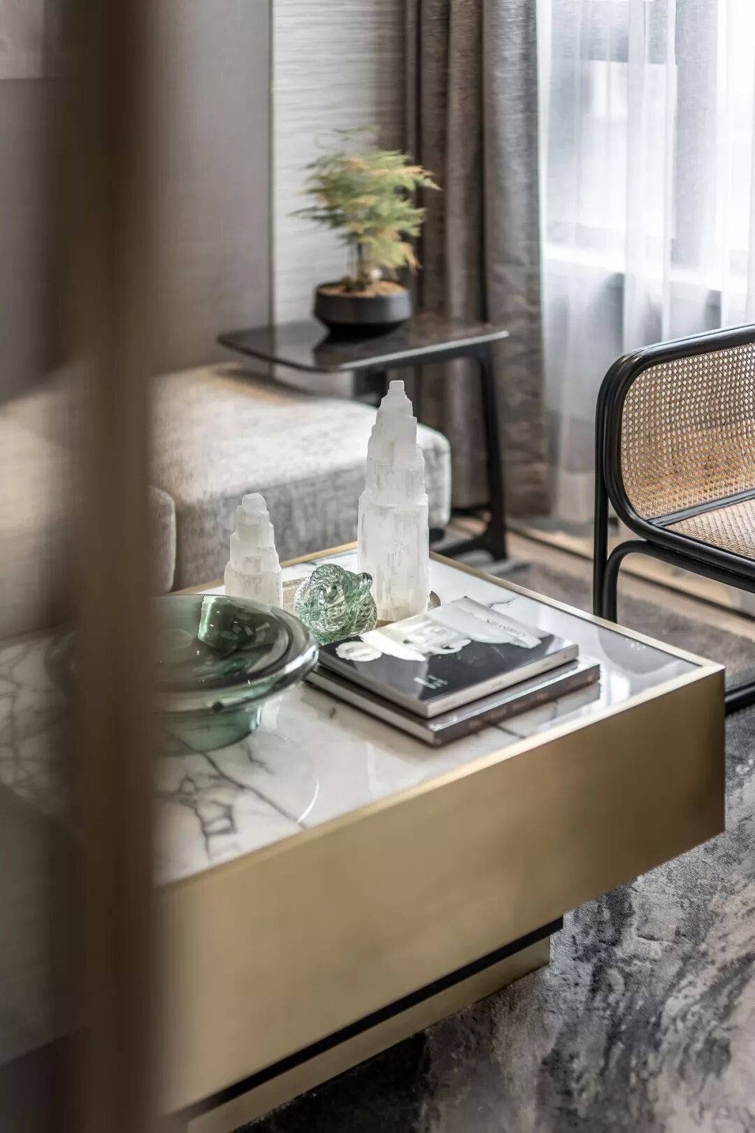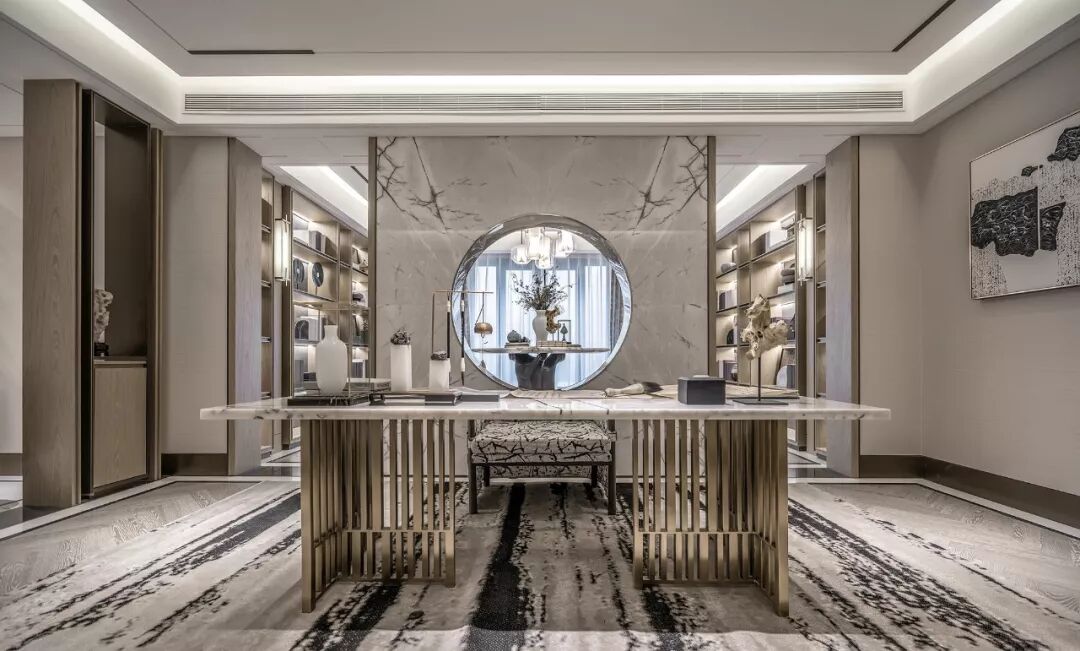 高贵的气质在高级灰与清雅的绿色结合的刹那占领整个空间,出于对传统文化内蕴的理解和传承文脉的高远信念,在吊灯温润的质感与盈透的色泽中,闪耀着粼粼波光。