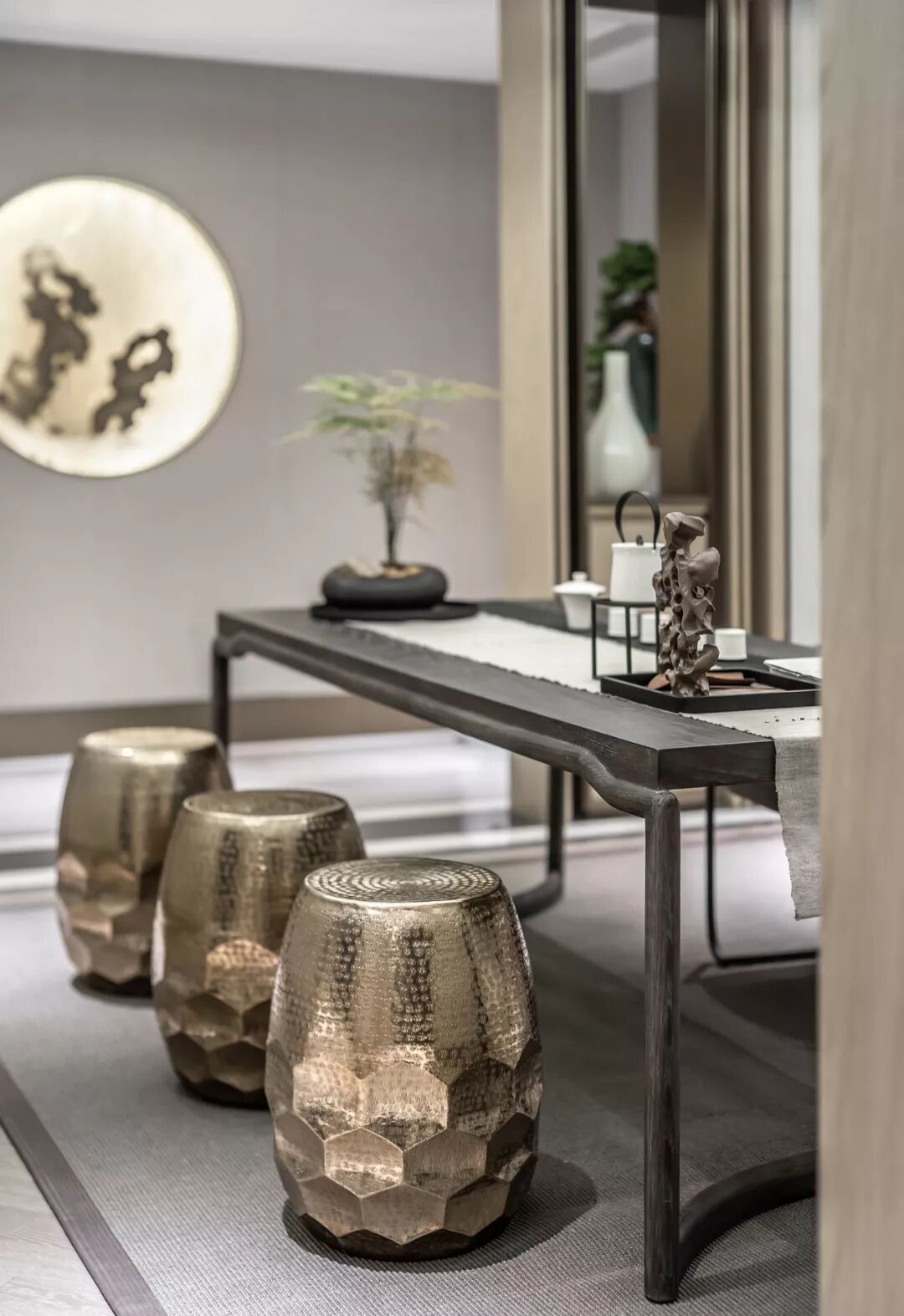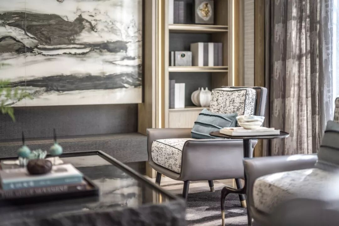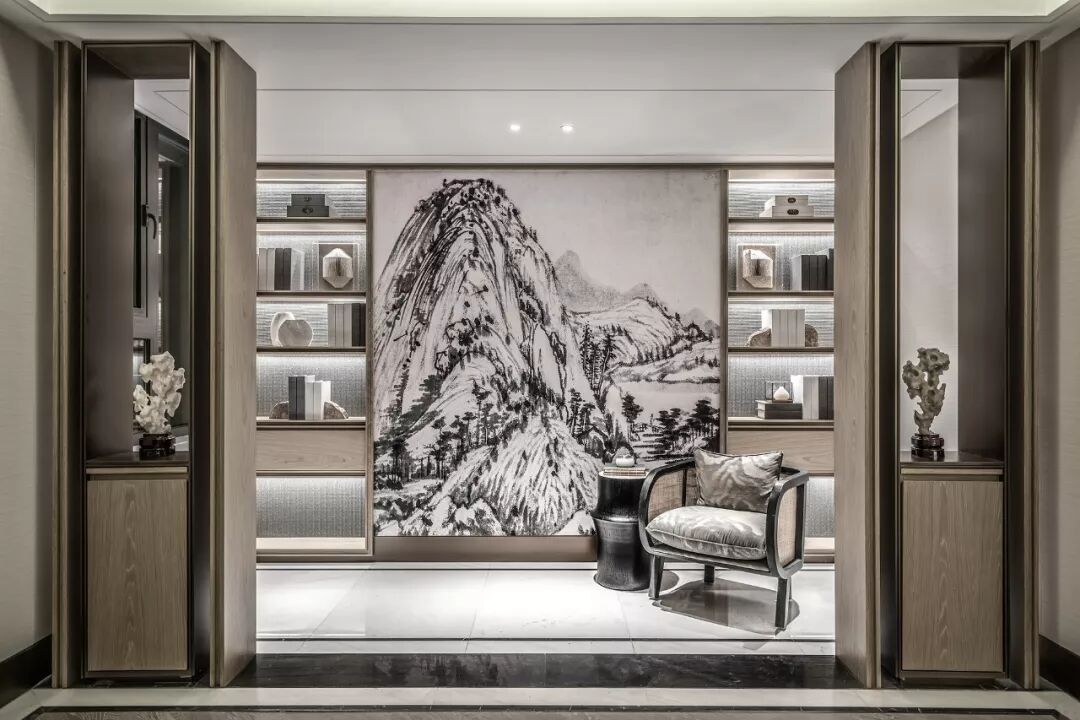 在家庭厅,设计师用当代写意的手法再一次将“一城山色半城湖”的意境展演出来,画里画外、墙上墙下,物质的界域被打破,任由艺术的能量倾泻而出。