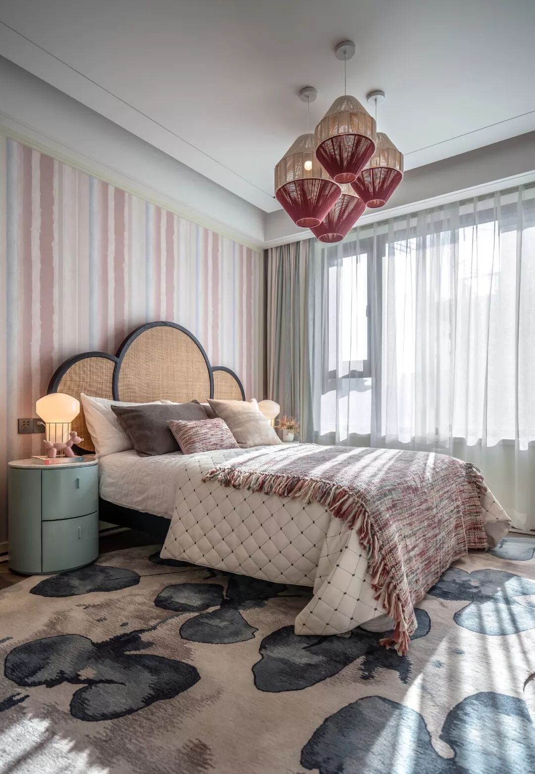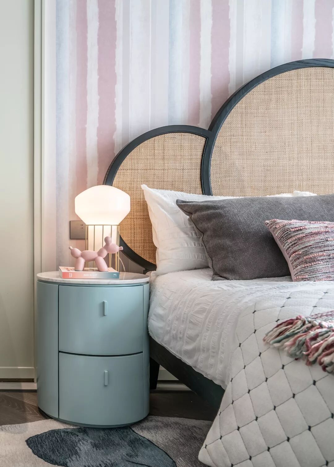 莫兰迪色的床头柜和一幅幅别致的装饰画在打破之余又平衡了空间界域,为空间带来别样的柔情,在现实和梦幻的交界处,一种叫“浪漫”的东西在慢慢升腾。