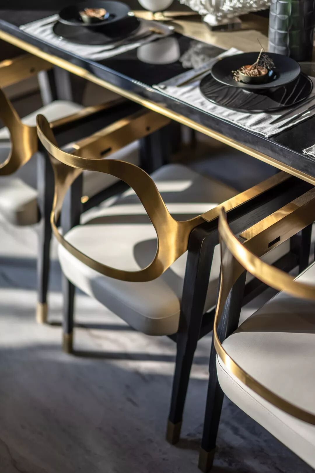 餐厅配合着极简的设计构思, 色彩上以沉稳的黑、华丽的金为主色;看似随意的一把绿叶,如清风徐来;雅白如玉的饰品,演绎出东方文化的清雅韵味。