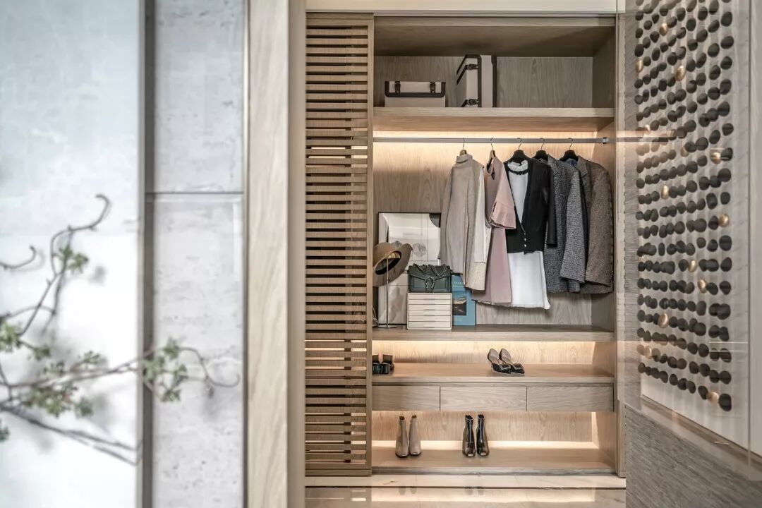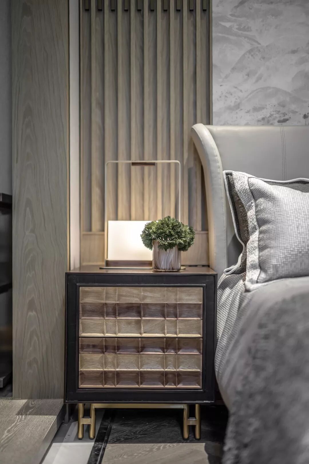 次卧的设计中,色彩的运用冷静且克制,沉静的灰调和趋近自然的木色是空间的主调。背景墙上将大理石与木格栅并置,于材质的碰撞中觅得内在的均衡,大理石的纹路自然演绎了一幅自然山水之美,赋予空间绵绵不尽的诗意想象。