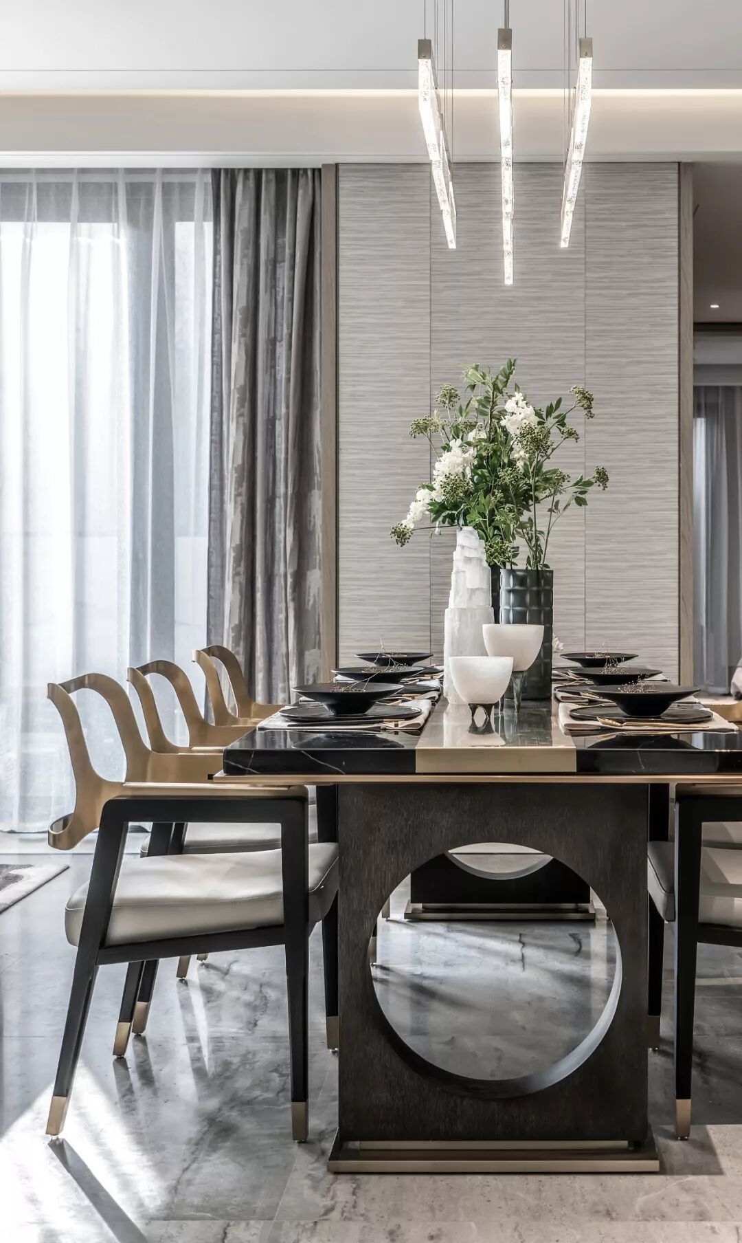 空间中,材质的混搭与精致的工艺形成一场精心的铺排,餐桌上花艺的介入让空间形成去物质化的诗意,呈现雅静风清的舒适感。