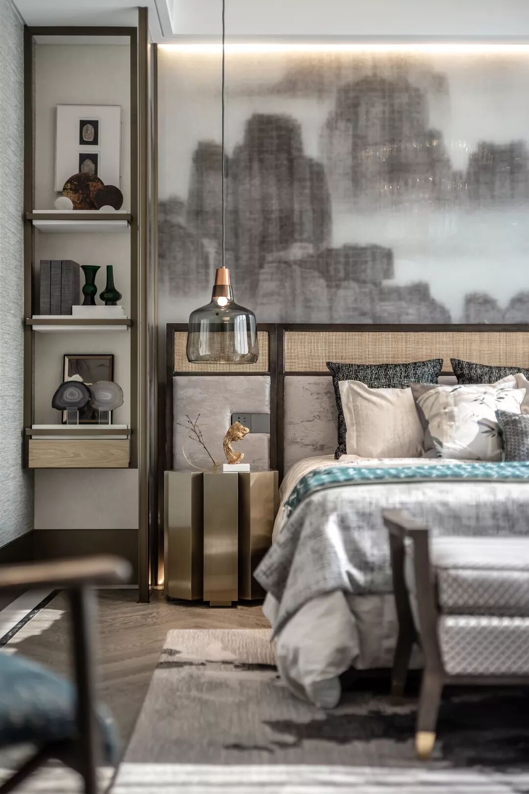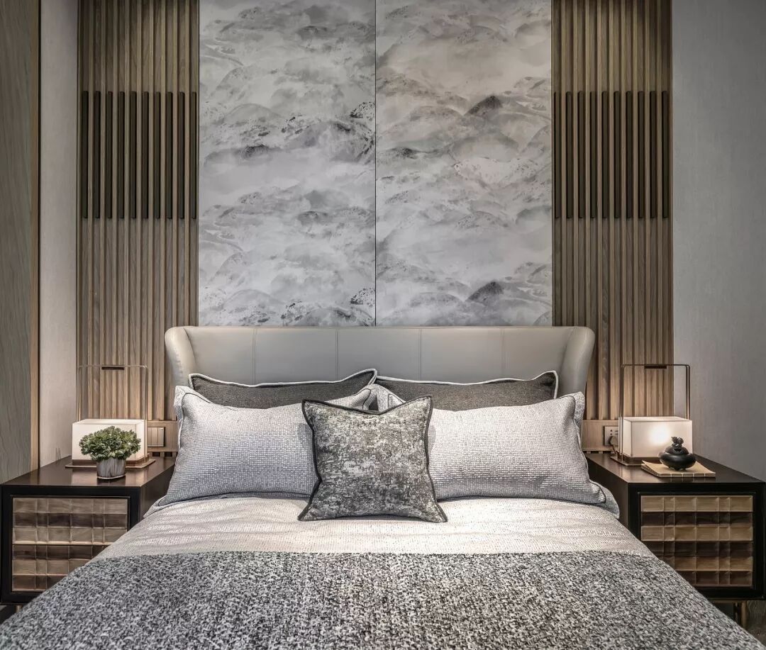 步入主卧,床头背景墙上,一幅水墨画营造静中之境,剔除琐碎的装饰,与特殊定制的床头与边柜形成呼应,简洁的形式、柔和的线条,清寂的装饰,不同材质与肌理的碰撞,让人不觉漫游在传统与现代交织的艺术世界。