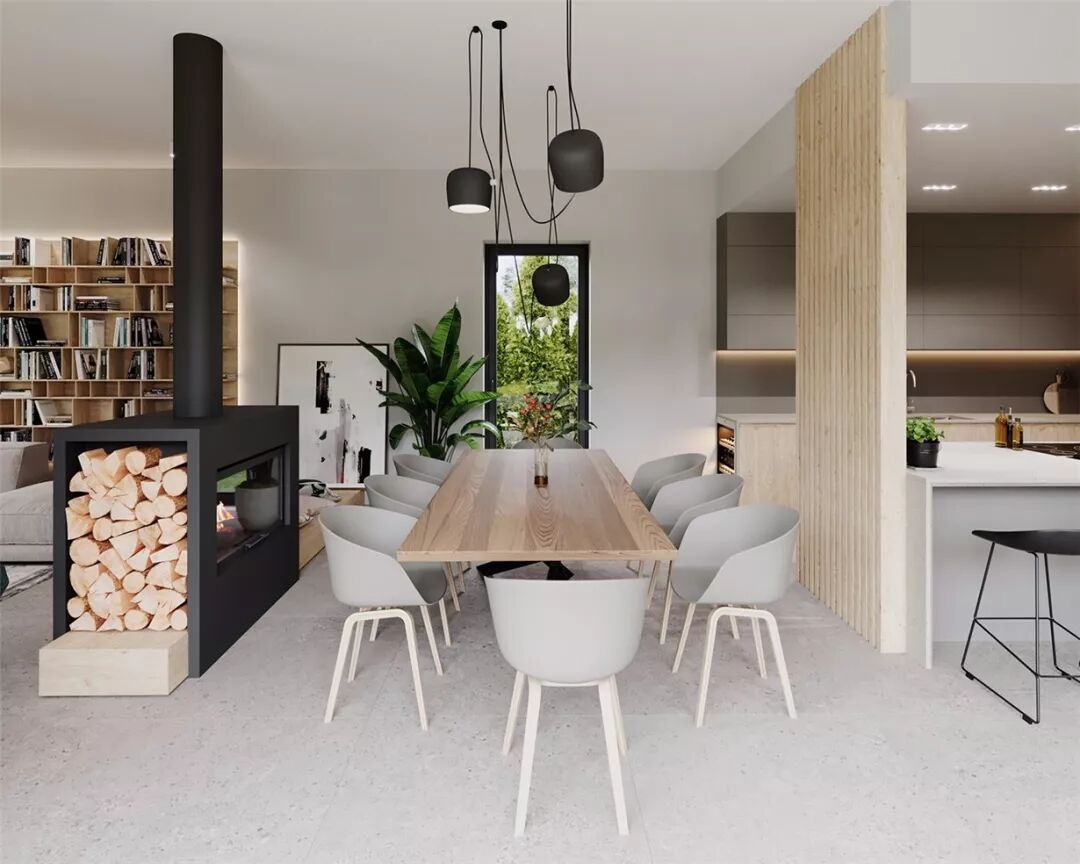 ▲开放式的布局里,壁炉或是木条都成为了划分区域的隔断,同时也是室内的装饰品。