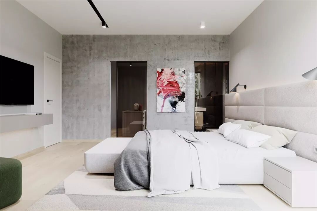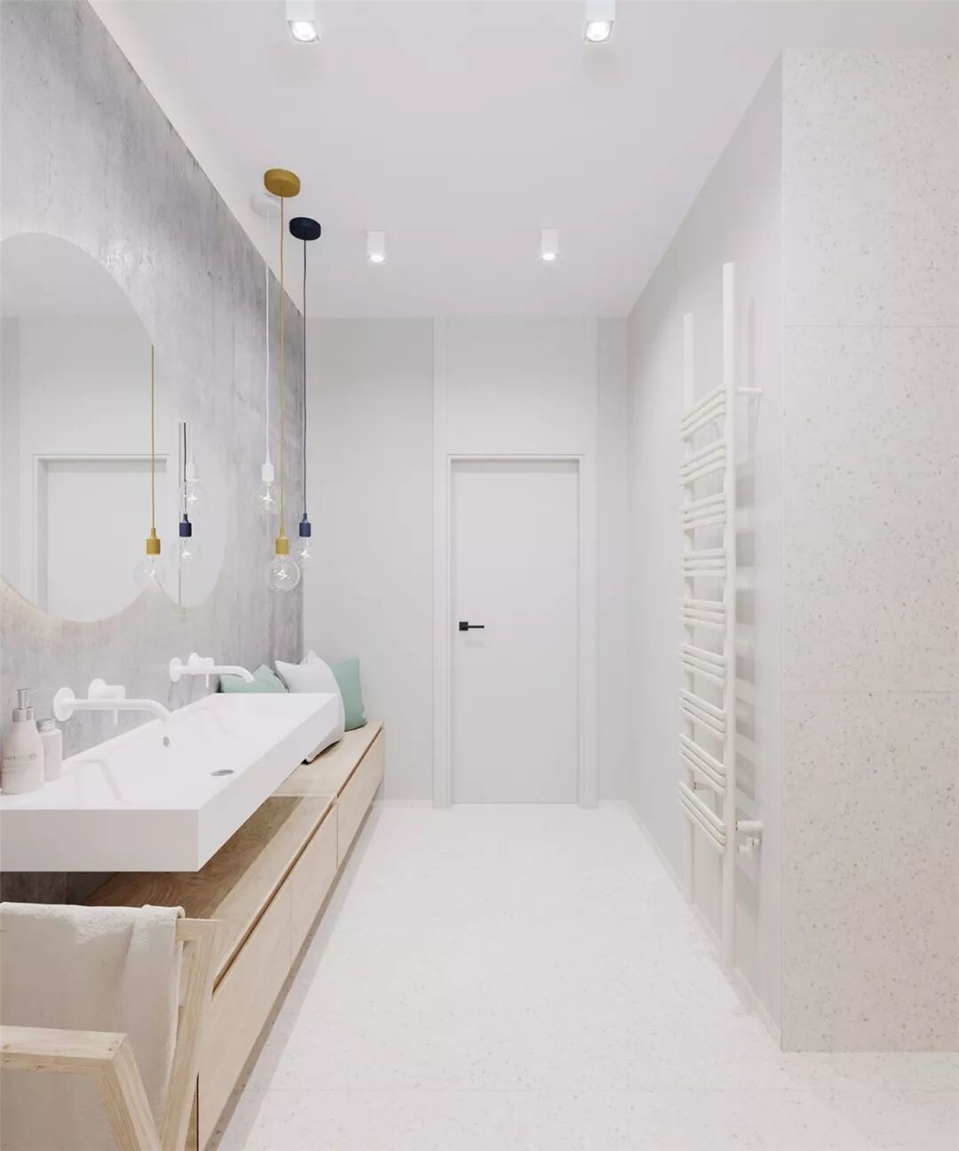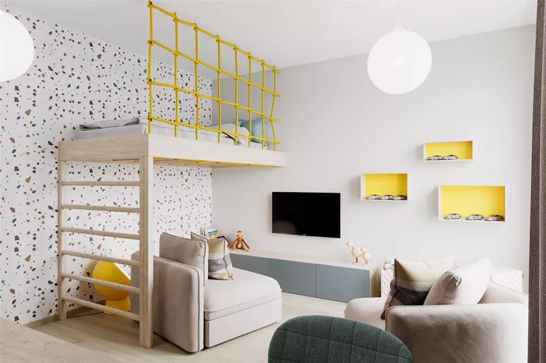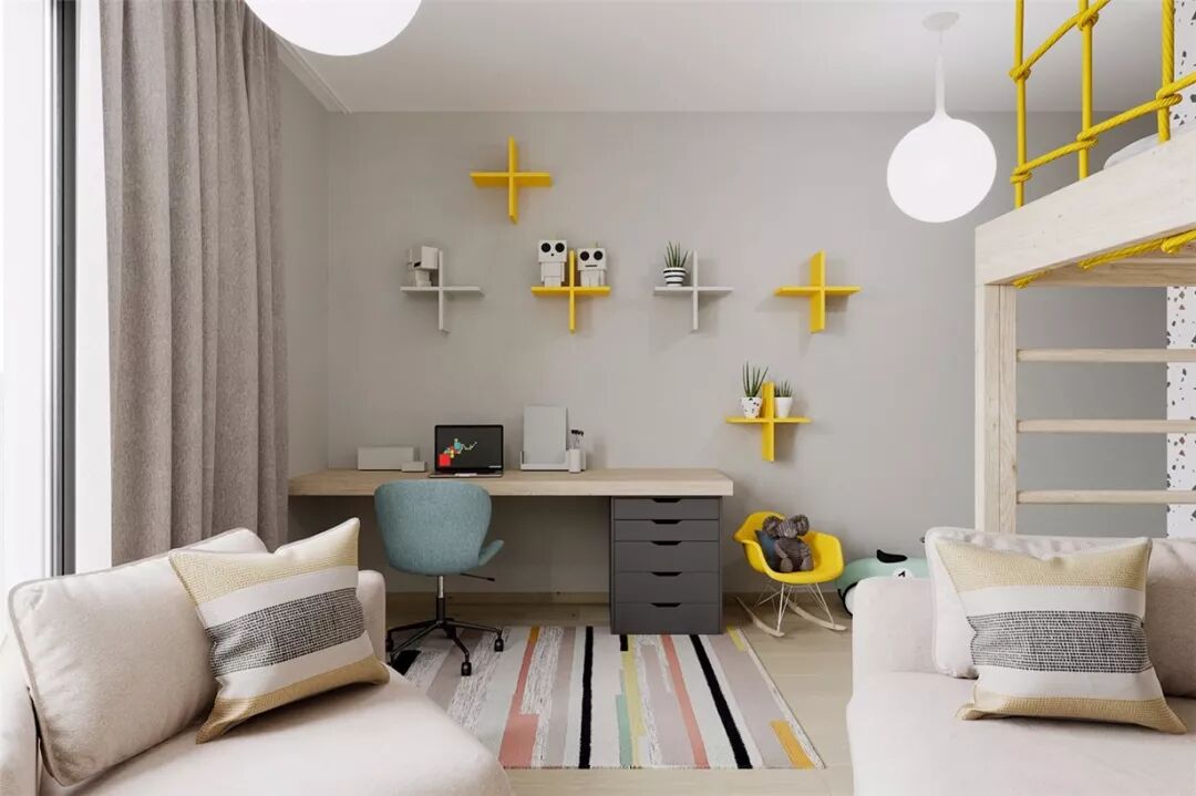 ▲儿童房依旧延续了整体的灰白色调为基底,同时考虑到孩童应有的俏皮与活力,通过斑点的壁纸以及柠檬黄进行点缀,除了应有的睡眠、学习功能区外,设计师还为孩子规划了小片的休息区,让家中的每个人都拥有属于自己的放松地。