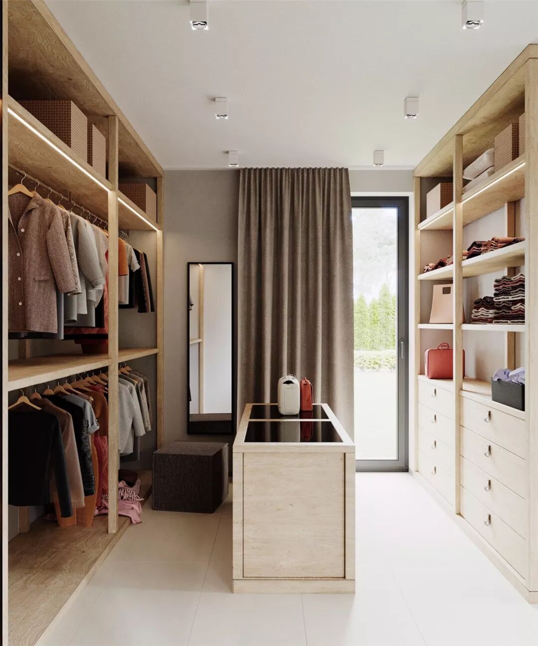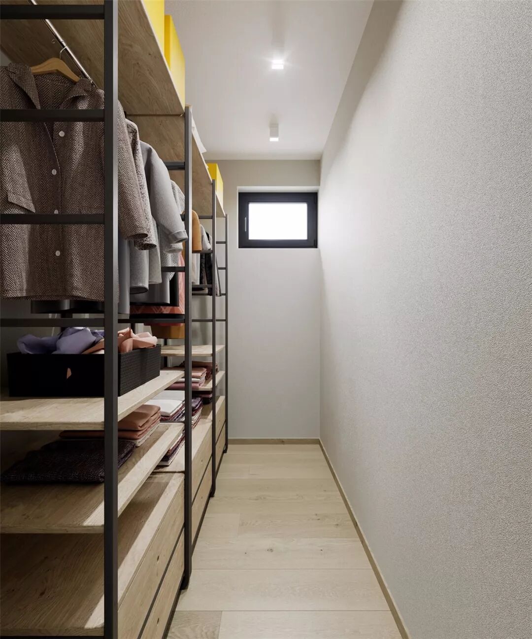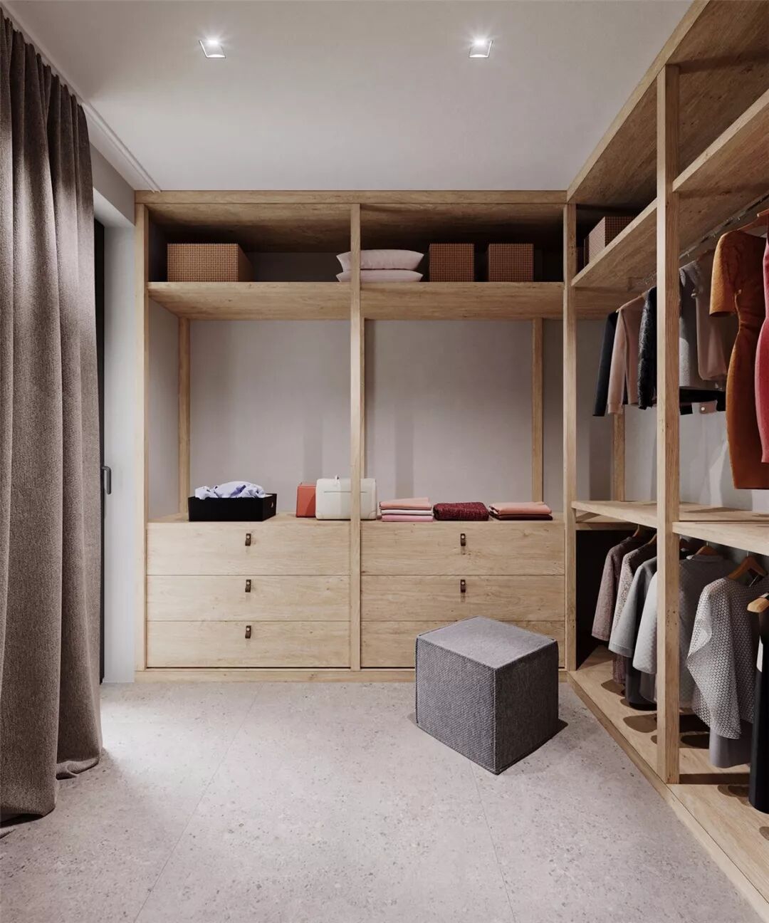 ▲木元素定制的衣帽间,解决了衣物的收纳问题。