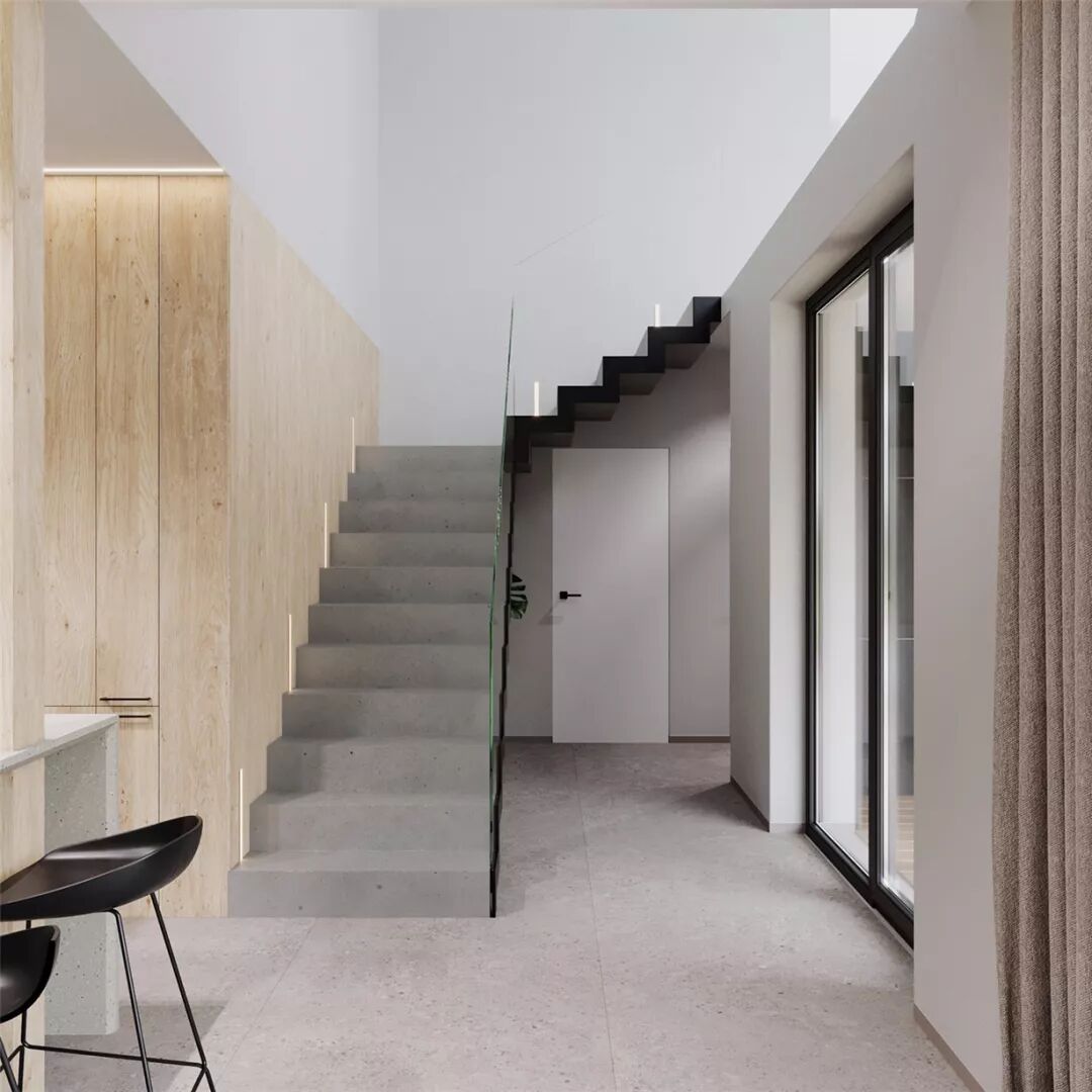 ▲通往二层的楼梯,利用厚重的混凝土与轻盈的透明材质的安全栏进行反差对比。