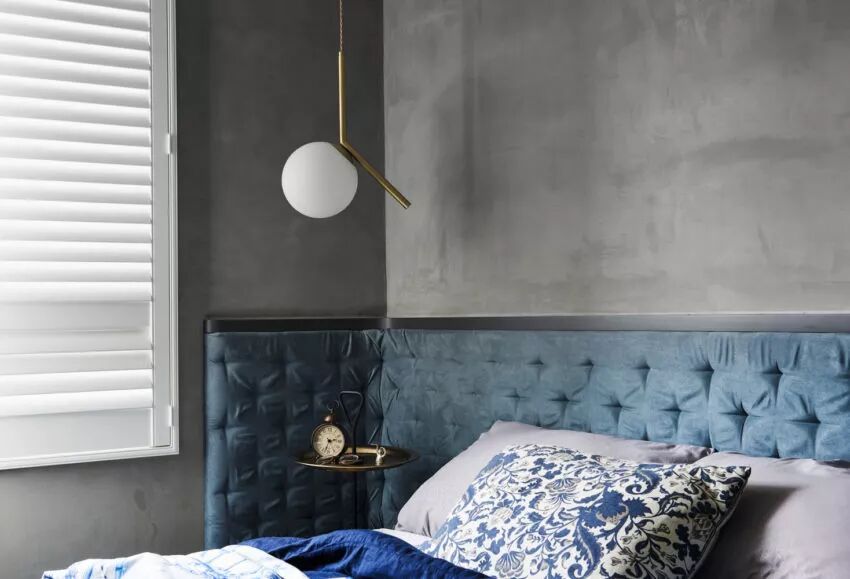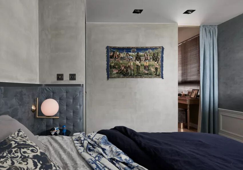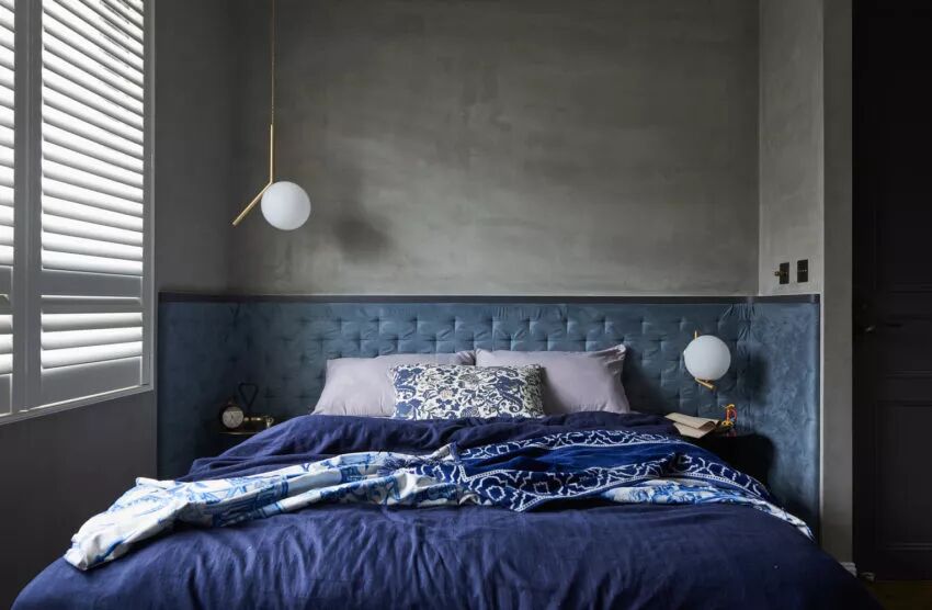 ▲主卧延续了公共空间的风格,但同时,在冷硬的工业风中加入了柔软的织品,带来温暖与舒适的触感,蓝色,是静谧,是优雅,也是一种追求精致的生活态度。