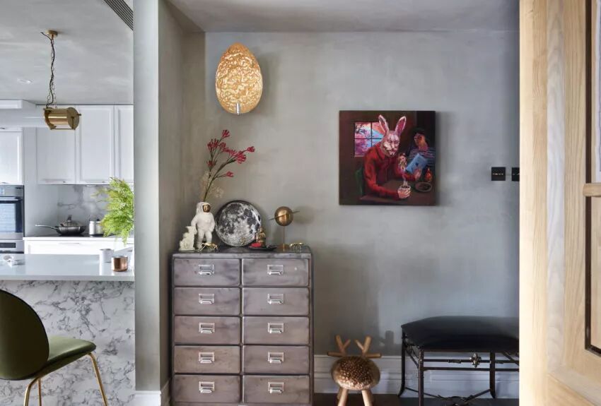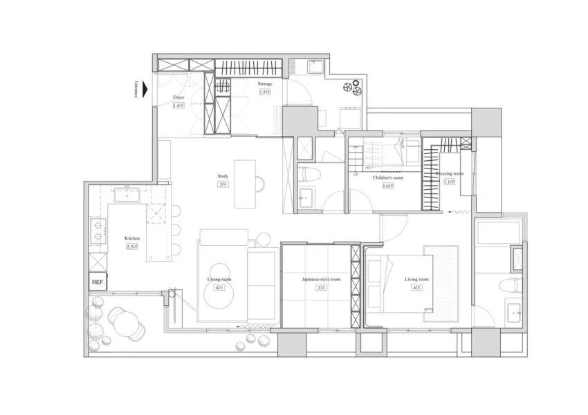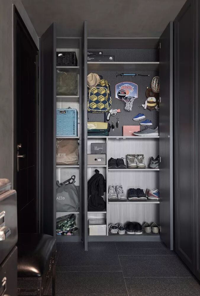 ▲考虑到孩子出生后空间对储物会有越来越多的需求,设计师便尽可能多的增添室内的储物空间,入口处与混凝土墙面“融合”的灰色储物柜,解决了进出门的生活准备。