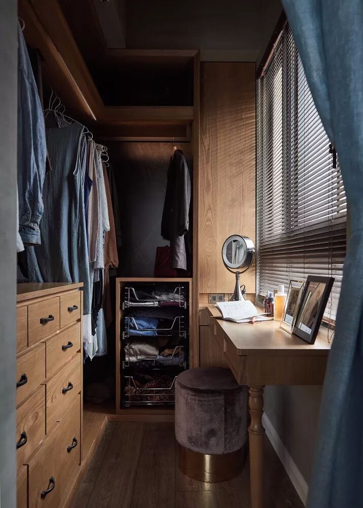 ▲与卧室相连的小隔间,定制了整面的衣柜,木元素与黄铜的搭配下,优雅且质感。