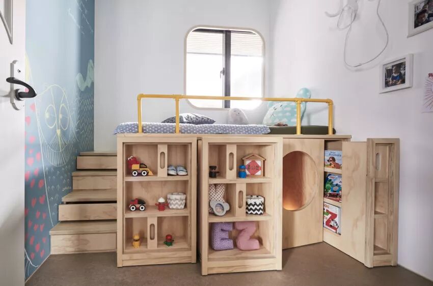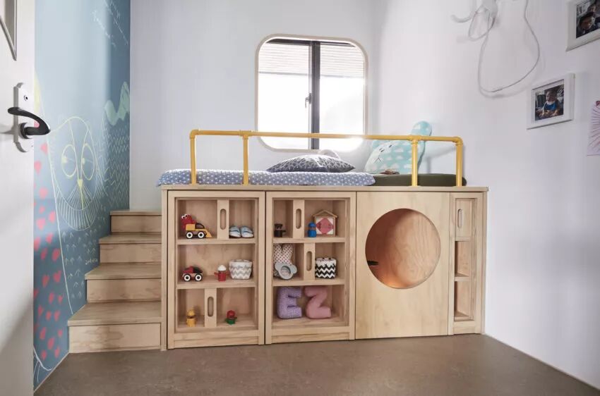 ▲整个儿童房就像一个童趣十足的游乐场,浅蓝的墙面,定制的家具,兼具了睡眠以及储物、玩耍的需求。