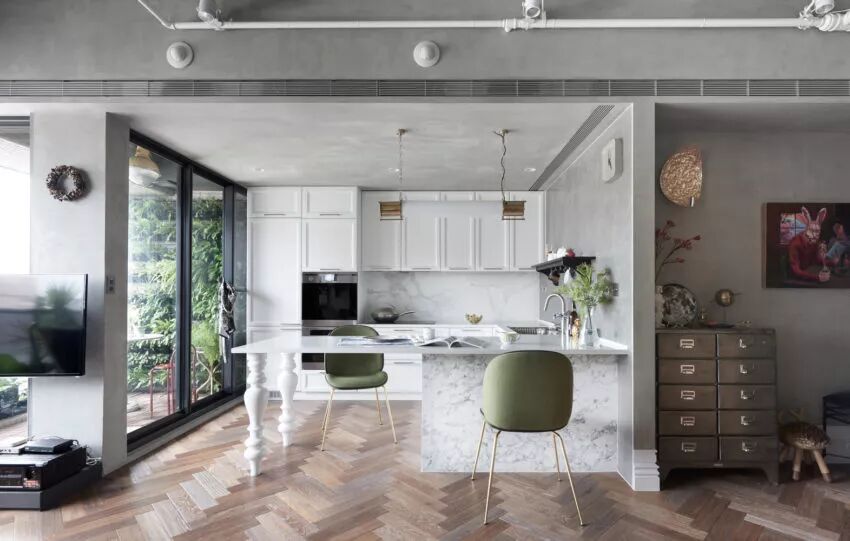 ▲除了隔墙外,墙面以及天花的表层也被铲除,直接的裸露,让空间拥有工业风的利落与硬朗,并通过人字形拼贴的木质地板,平衡空间的氛围。
