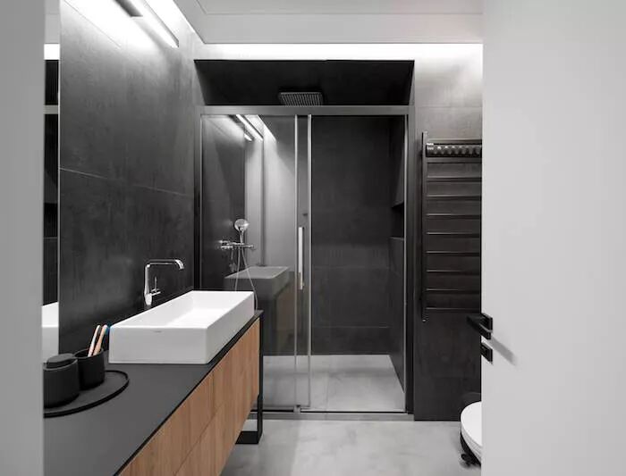 ▲将室内的元素全部用在洗浴室,合理的色块划分,依旧可以营造出空间的利落清爽。
