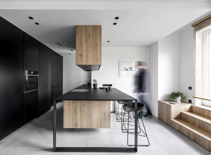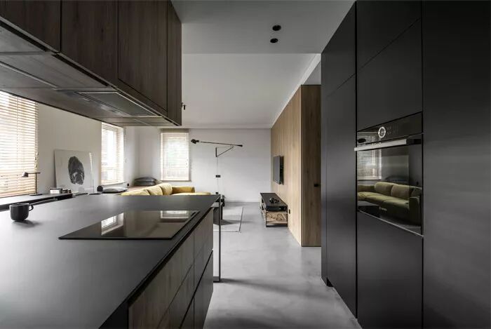 ▲开放式的布局几乎成为了小空间的必要手法,白净的基底下,木色是温暖而舒缓的,黑色则是鲜明利落的,色彩与材质都成为了对比喻融合的平衡界线。