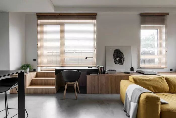 ▲整个公寓中的家具几乎都为单独的定制,整面的电视墙,同元素的边柜,甚至是工作桌也成为柜体的一部分,朋友来访的闲聊,也不仅仅被局限在沙发上,简单的台阶可以带来更有趣的对话。