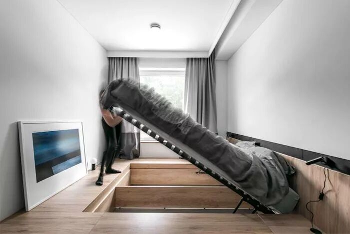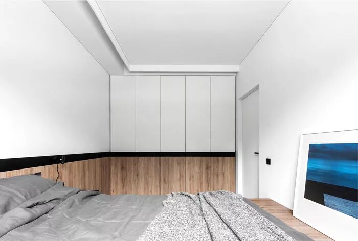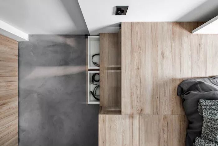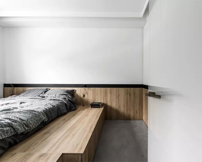 ▲传统设计里,衣柜与床都是单独的个体,而在本案中,设计师将它们连为了一体,色彩与材质的延伸,仅通过架高的台面划分区域,除了墙面柜体外,整个架高区域都成为有效的收纳空间。