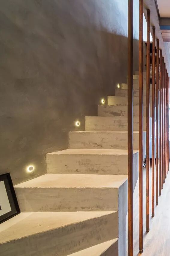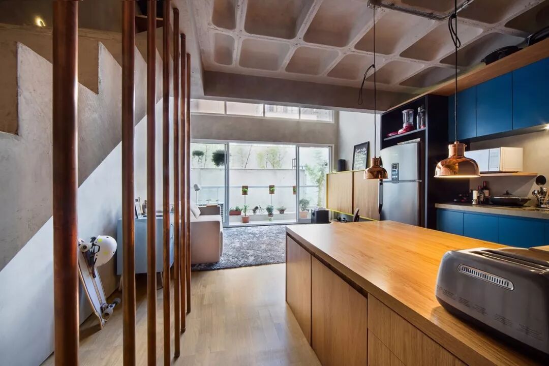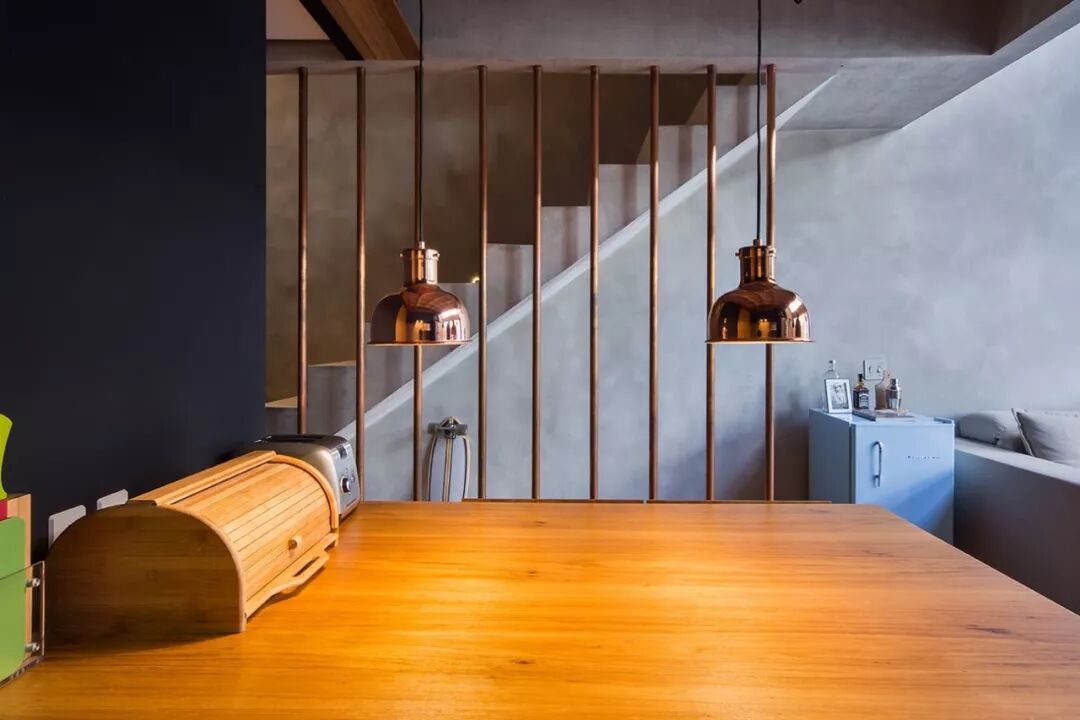 ▲设计师从装修成本、后期维护的难易度以及视觉效果综合考虑后,决定铲除墙面表层,直接裸露出混凝土,并通过简单的修复,原先的安全护栏也改为了连接上下层的金属管,以轻工业风的魅力,得到重现。