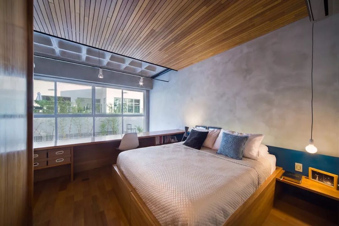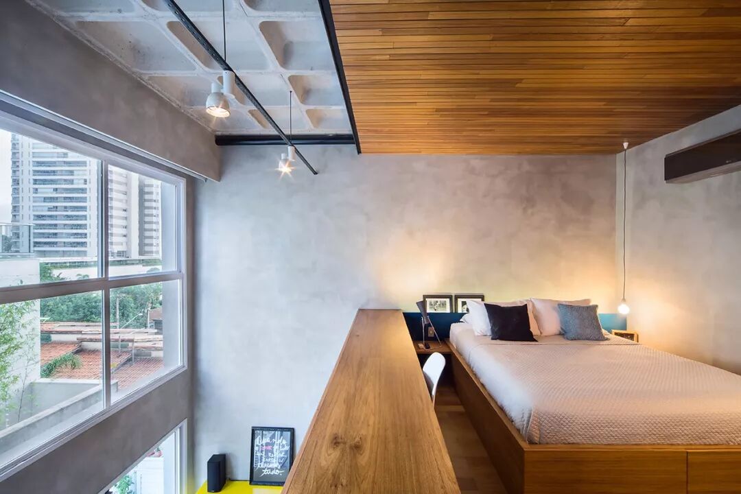 ▲二层作为了私人区域,扩大高度让更多的光线可以照射进室内,护栏甚至是双人床,依旧来自木工的定制,温润的木质与冷硬的混凝土,平衡了空间的氛围,巧妙的储物也避免了物品的杂乱。