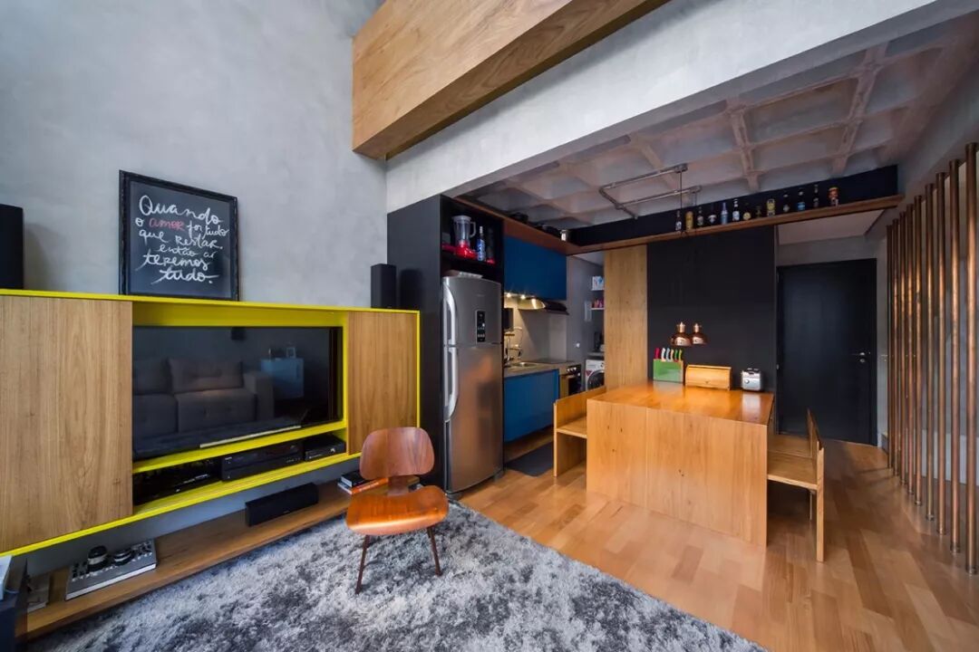 ▲开放式的布局下,灰色地毯划分出客餐厅区域,定制的电视机柜可打开或关闭,荧光黄的色彩,增添个性。