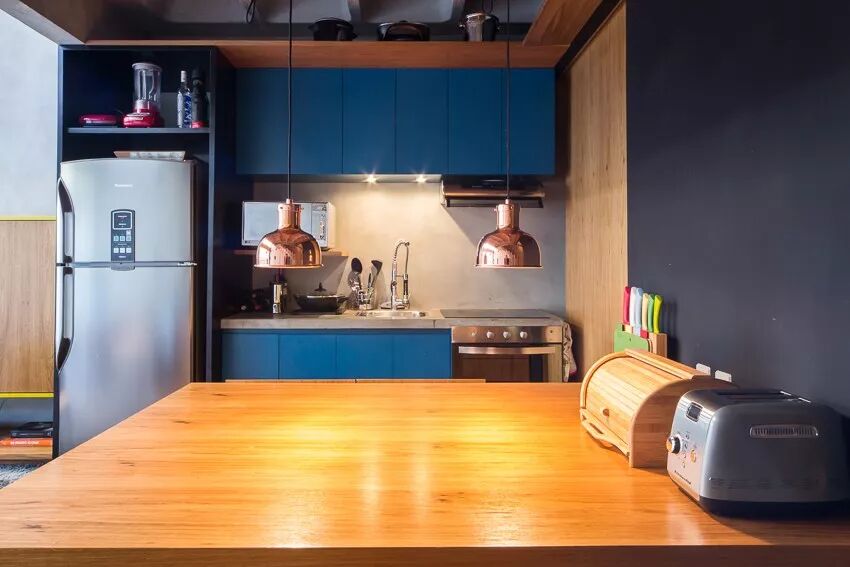▲定制的中岛吧台兼具了多个使用功能,包括料理台、餐桌、办公桌,丰富的柜体也满足了小空间的收纳需求。