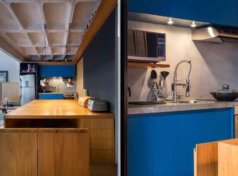 ▲厨房的宝蓝色延续至洗浴室,并通过花砖增添视觉感受。