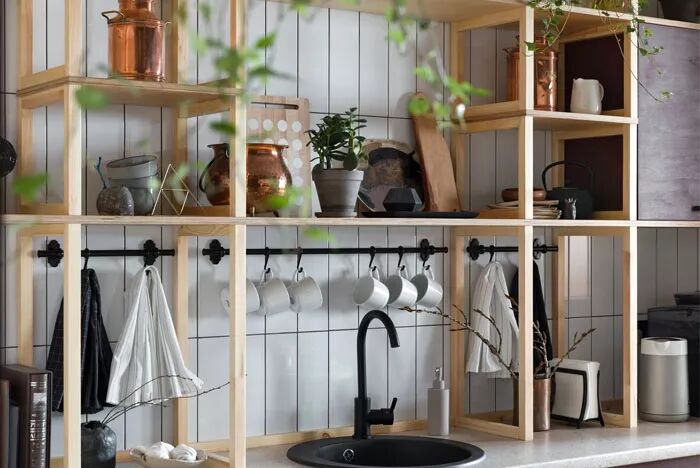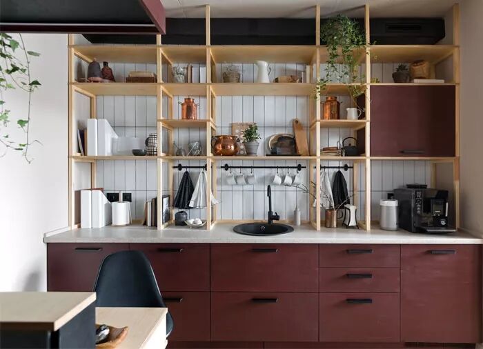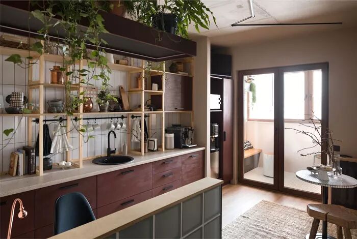 ▲视线随着功能区的改变而转移,每一处都是独立的个体,拥有着自己的鲜明风格,厨房利用木料定制了整体的橱柜,为了避免小空间将储物上移的压抑感,设计师利用细木条定制了上层的收纳空间。