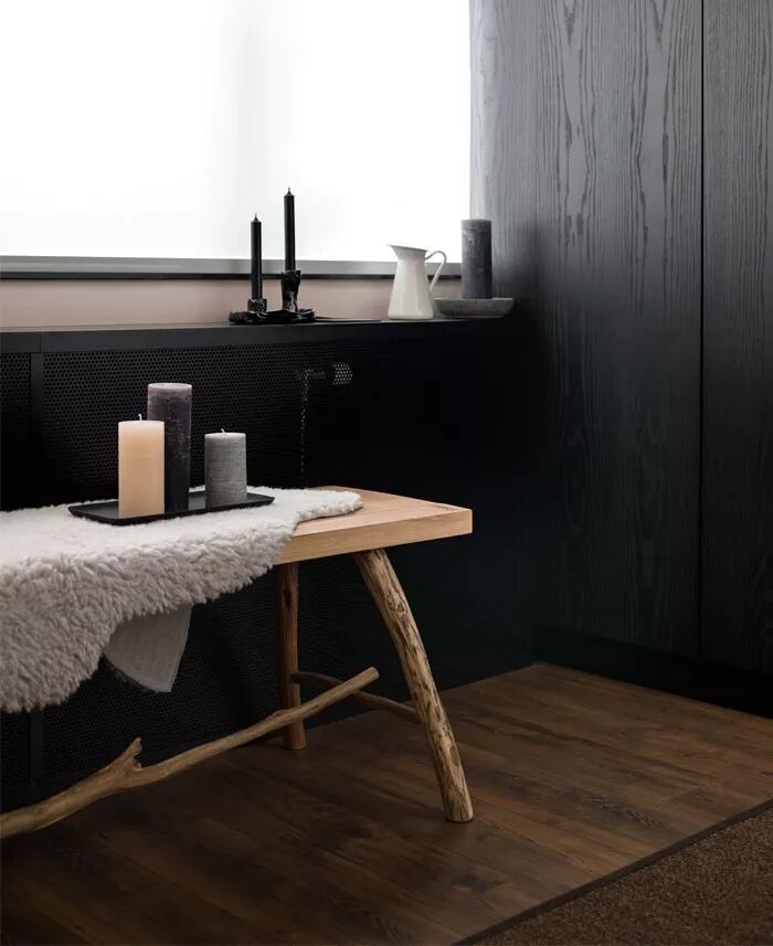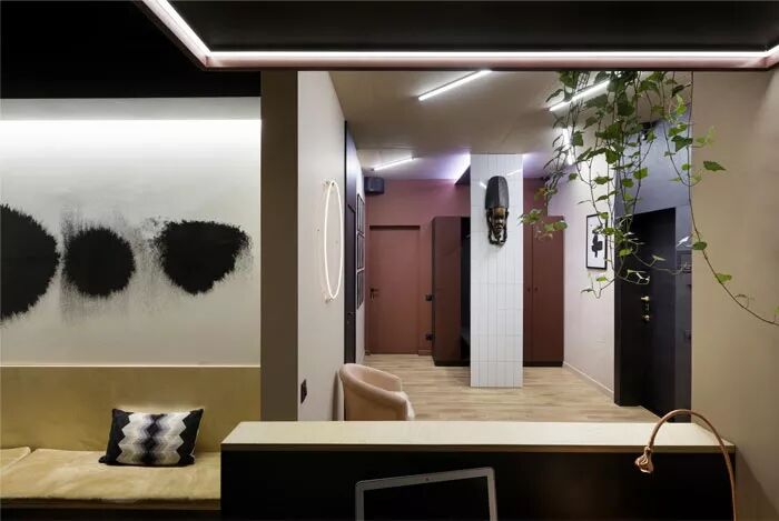▲入口处白色的基底下,绛红色的墙面带来了鲜明的对比,白色依旧是贯穿室内的色彩,利用墙边小片空间,设置休息室,墙面的涂鸦,与木质相融的色彩,“不和谐”的暖气片,也被巧妙隐藏。