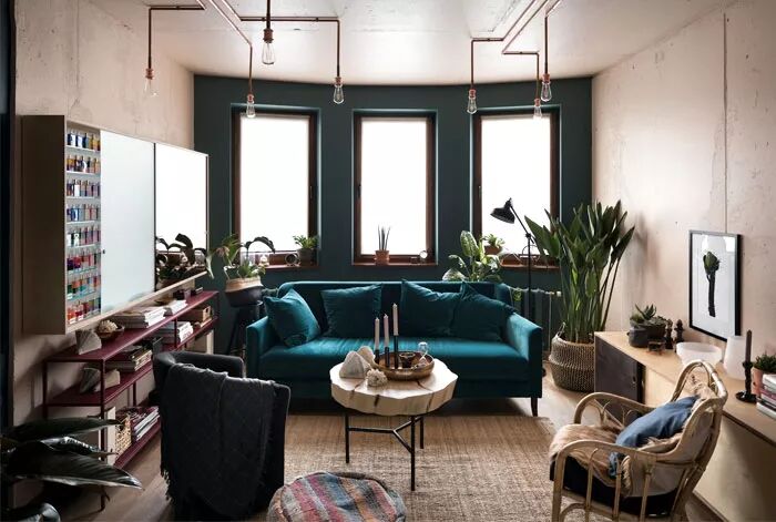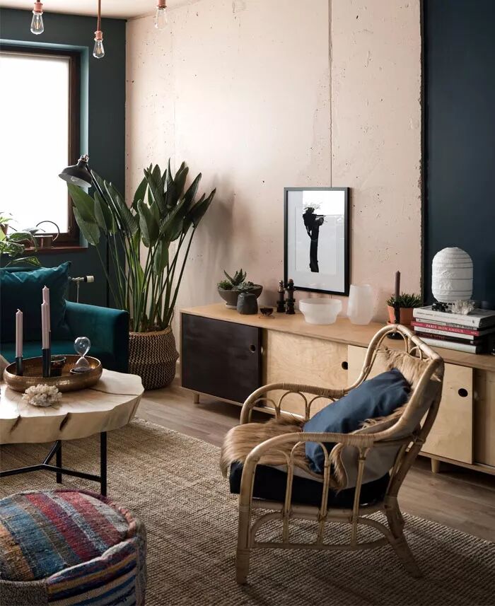 ▲这是一个多元素的“融合”空间,有清新自然的斯堪的纳维亚风,有硬朗利落的工业魅力,更有令人沉迷的非洲饰品进行点缀,柔和的米色,优雅的蓝色,甚至是设计师Olga Fradina手作的版画,Staritska Maysternya创作的原木家具,都让这里令人难忘。