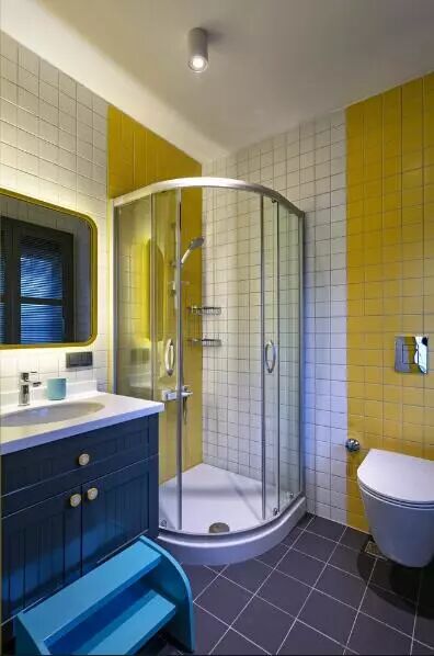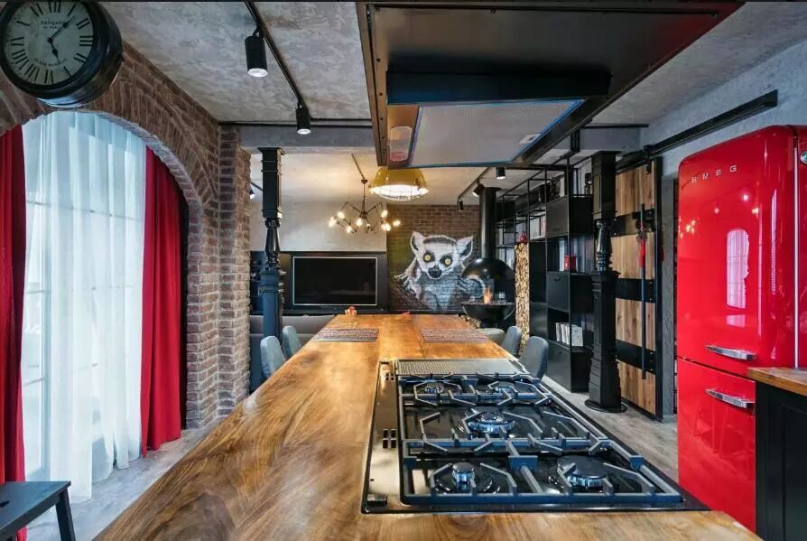 ▲原先的隔墙被拆除,如今客厅与厨房之间,仅以保留的横梁进行分隔,墙砖、混凝土、金属,以原始的材料塑造出粗犷硬朗的工业魅力,而鲜亮的红、黄色调,却打破沉闷,带来鲜明的对比。