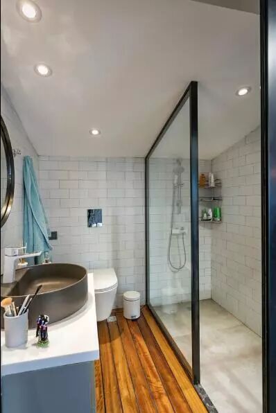 ▲公共区域与入口过道,以谷仓门进行分隔,将原先的过道一侧定制了整面的衣柜,镜面与玻璃,在灯光下,模糊了视线,起到了放大空间的效果。
