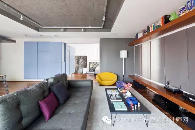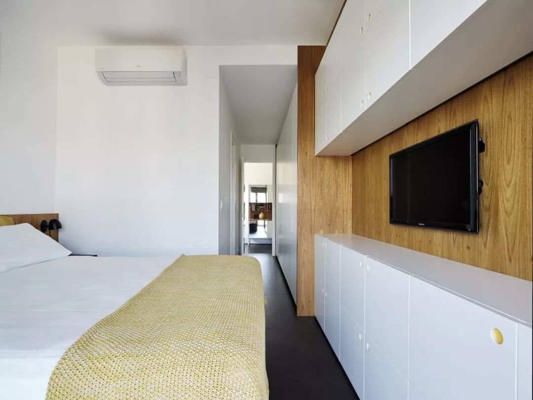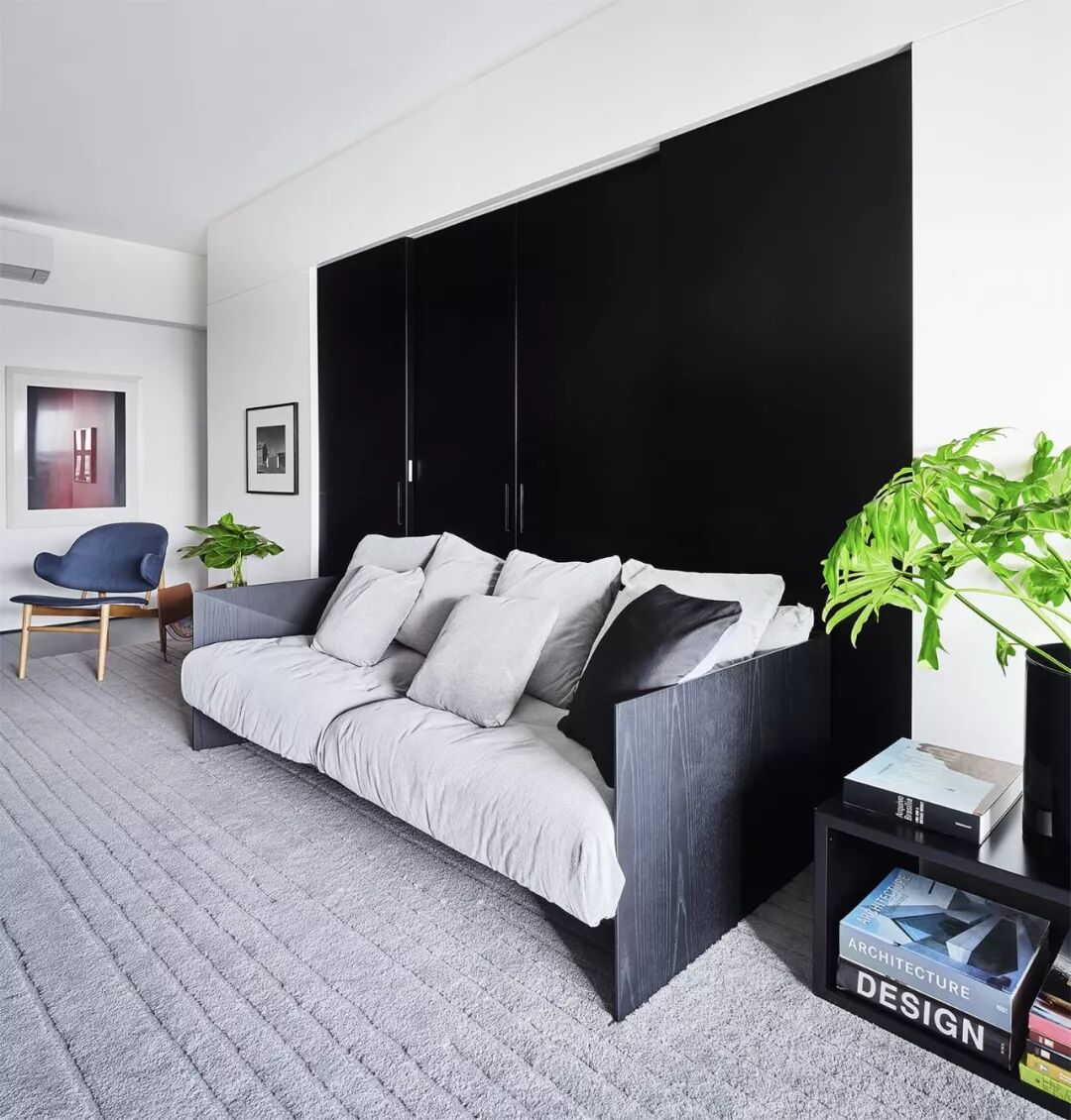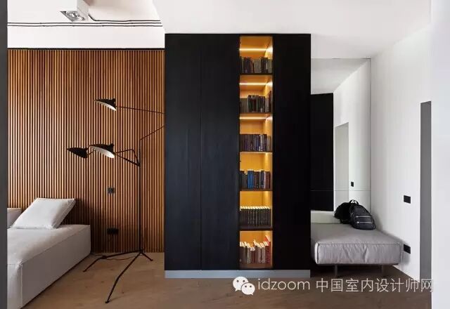 ▲由于放弃了原先的露台空间,室内面积就相对的减少,因此空间的通透性以及家具的多功能性变得尤为重要,考虑到日益增多的杂物,设计师从入口开始直至卧室顶端,定制了整面的储物柜,保证了全新空间的视觉清爽。