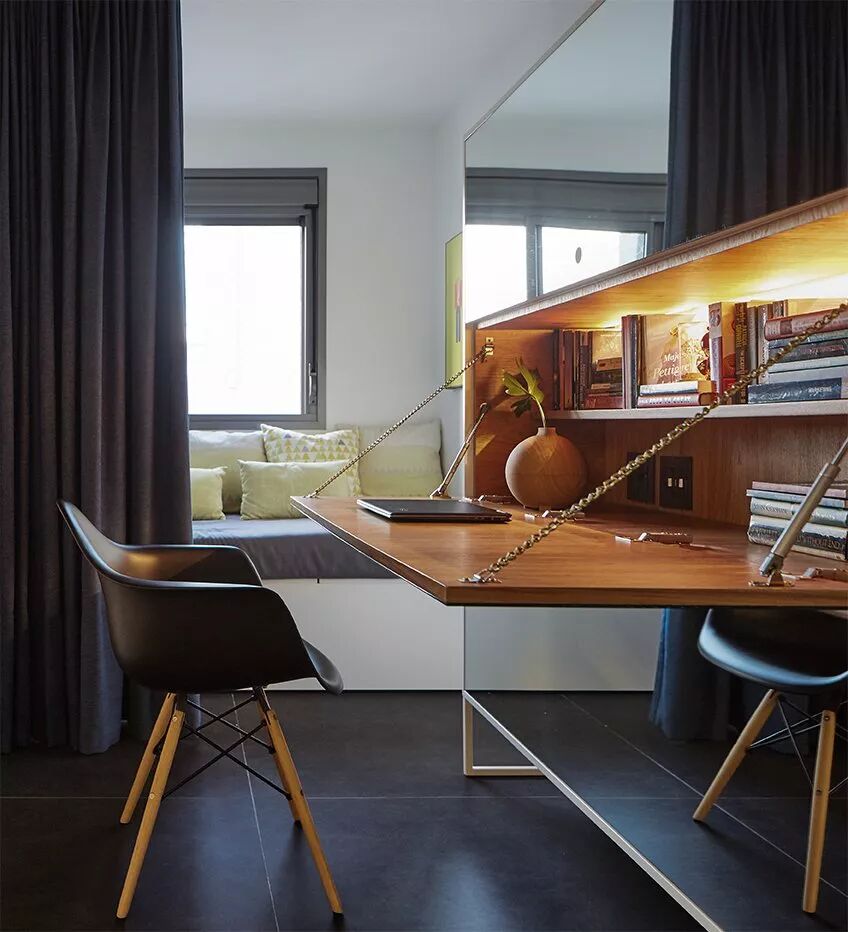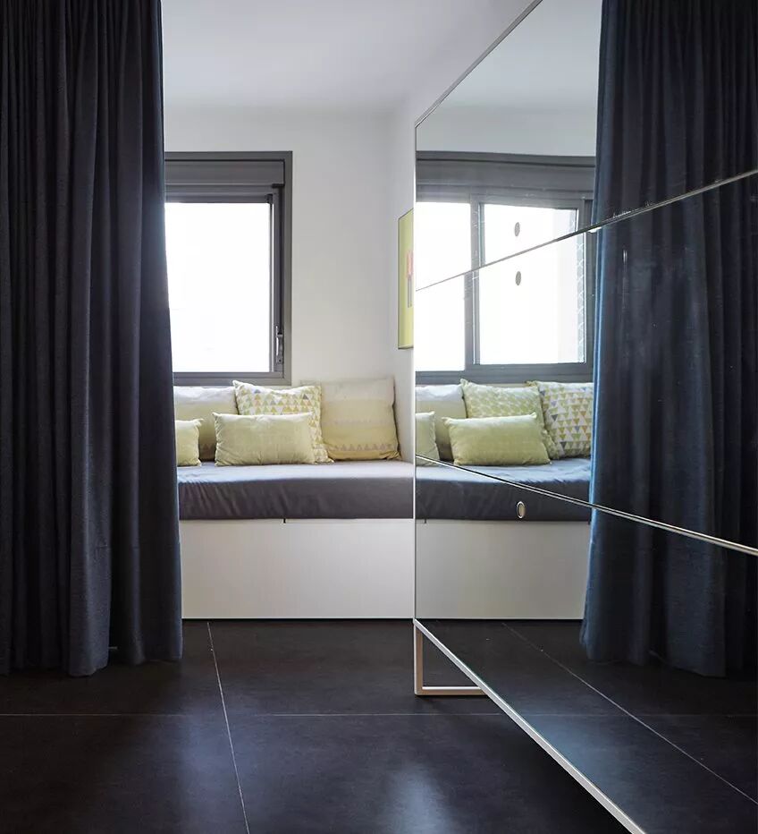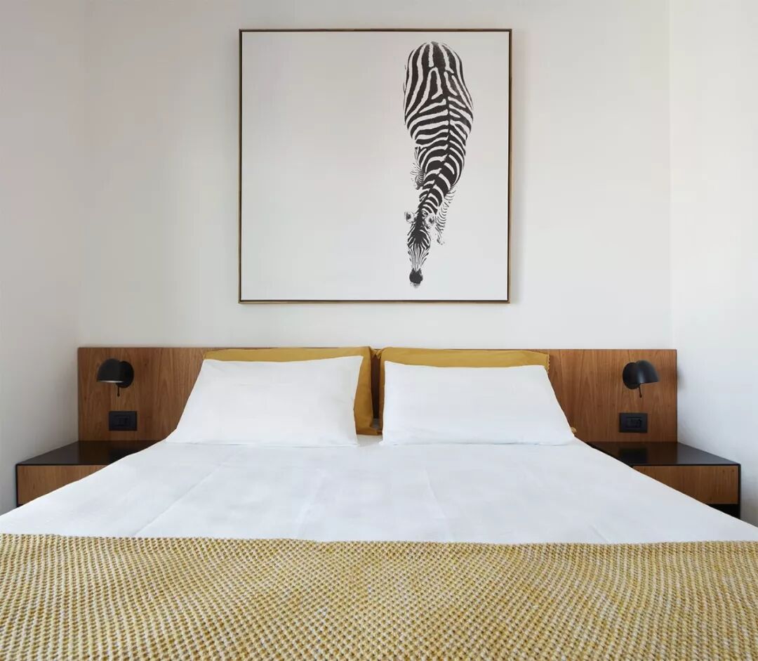 ▲次卧的设计简单却有趣,除了一张双人床用来招待来访的客人外,镜柜也可打开,收纳书籍或是作为办公空间。