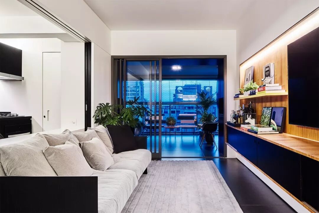 ▲室外与室内以玻璃门相连,充沛的光线尽情的洒入室内,留下宽敞的中央动线,让屋内温暖而明媚,色彩上的鲜明对比也因此变得柔和起来,嵌入式的电视机柜带来视线上的清爽感。