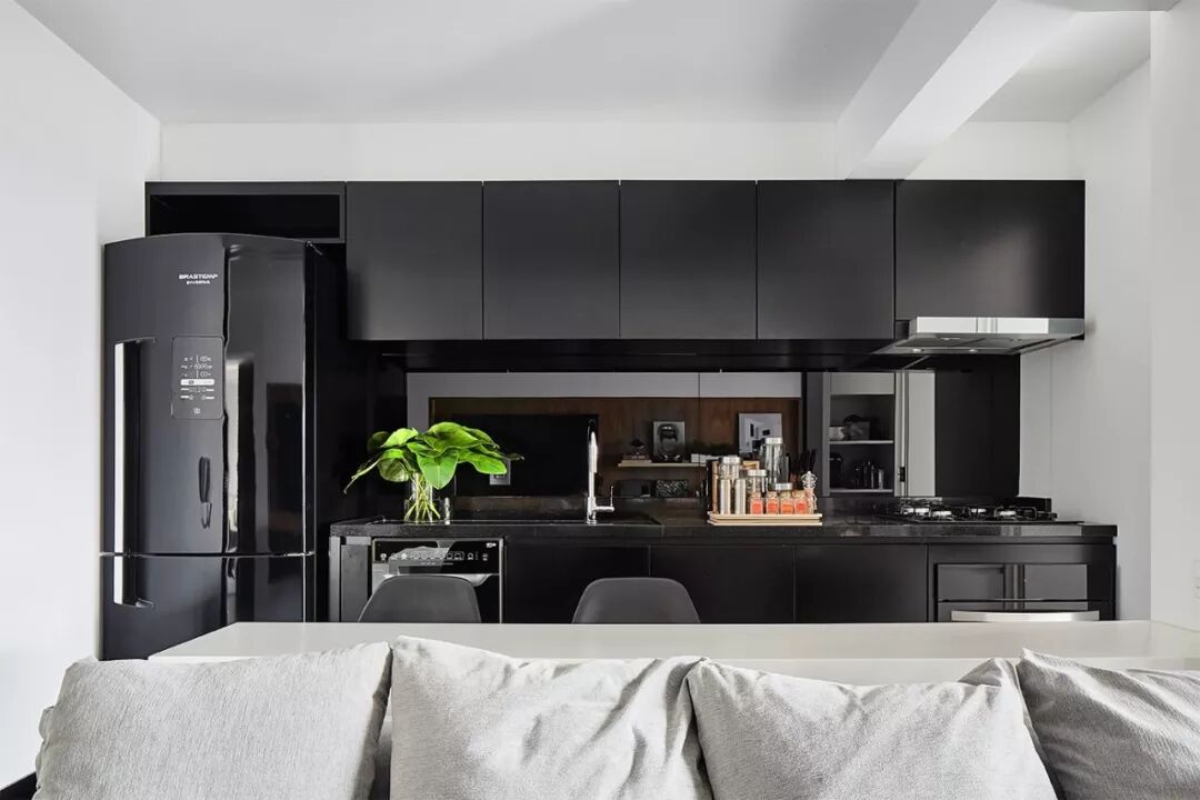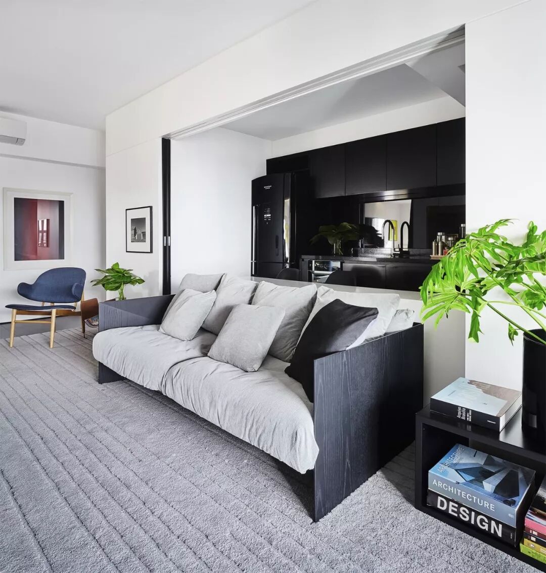 ▲年轻的屋主夫妇有着许多自己的独特见解,例如他们更希望有一个不同于以往的厨房空间,设计师便将它们巧妙的“藏”在了沙发后方。