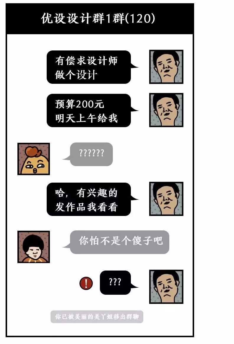 如果一个人给我两百块,让我随便画几笔的话,也许我会高兴的飞起来!但这些设计师却连基本沟通都不愿意,果然人一有钱就变坏。连基本的礼貌都不懂了…