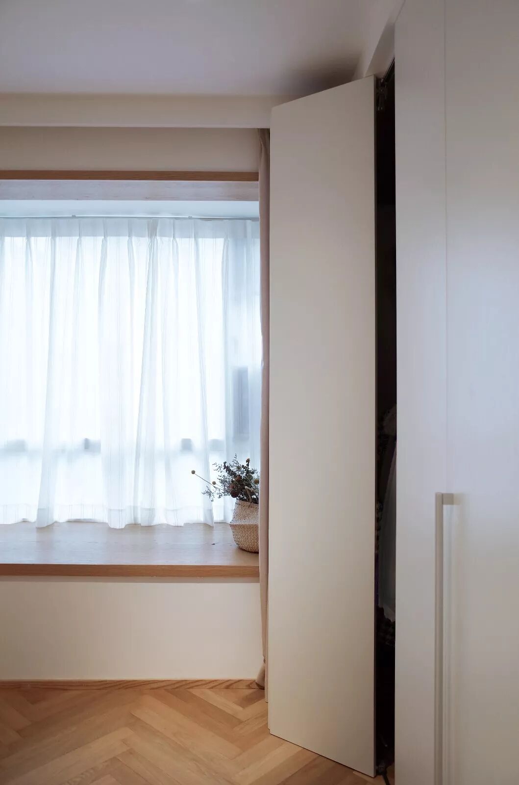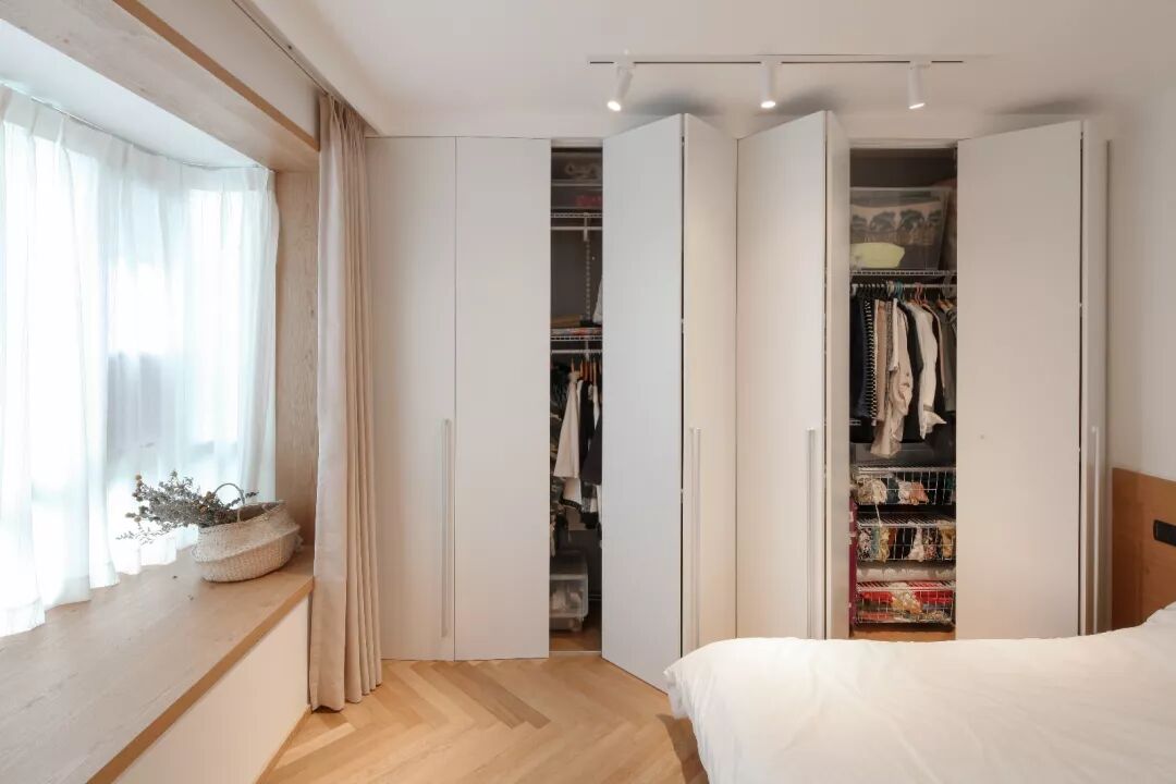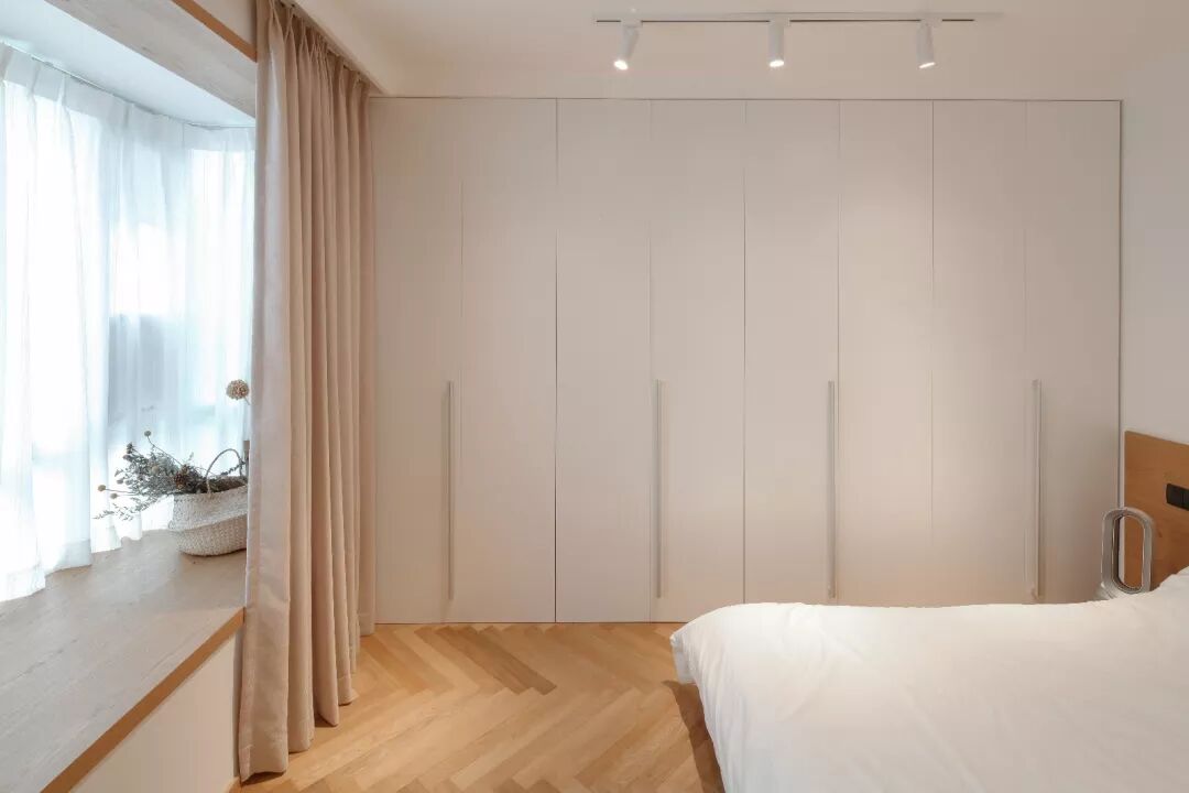 ▲把卧室的一侧墙面装成衣柜,提供了强大的衣服收纳空间;