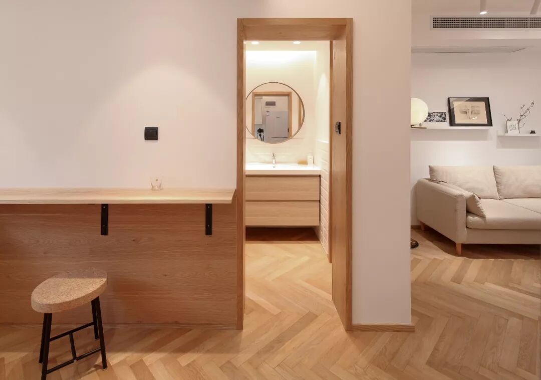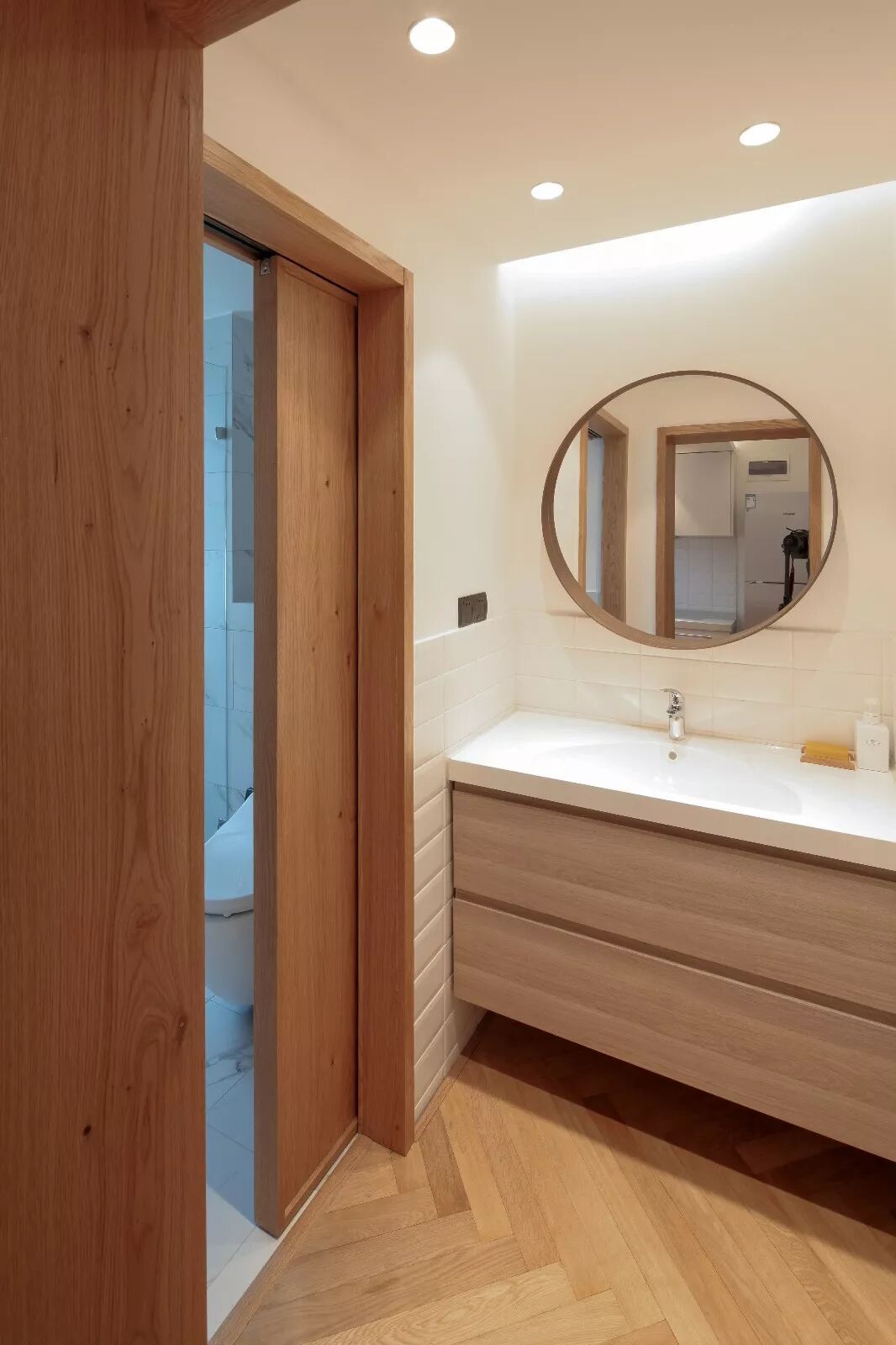 ▲把卫生间的洗手台设计在门外,上面挂着圆形镜子,木质感的装修搭配着白色文化砖,十分文艺;