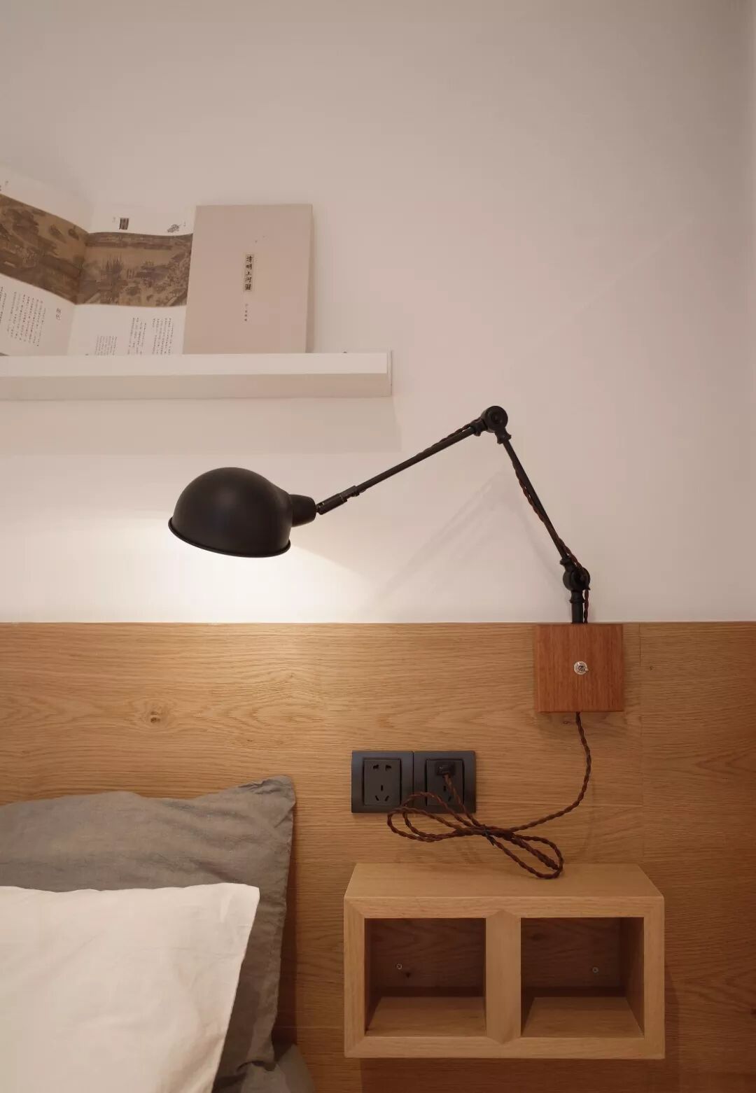 ▲壁挂式的床头柜,还有一盏床头灯,小巧实用;