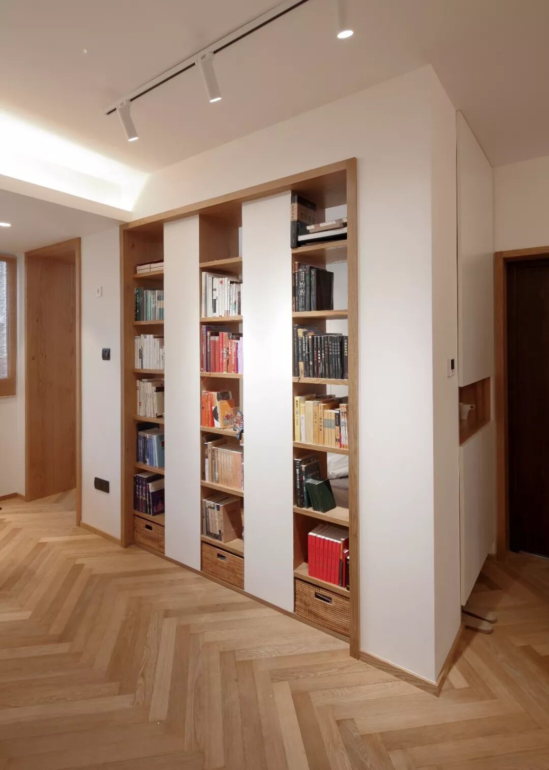 ▲这面卧室和客厅之间的墙被装成了书架,可以放上一些喜欢的书;